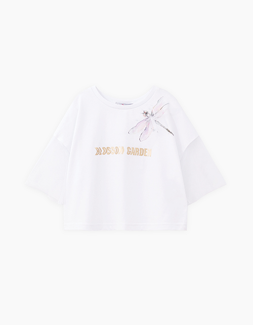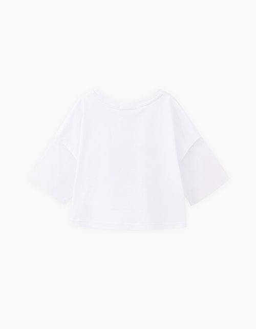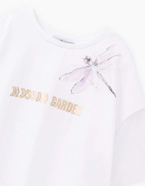Дизайнерская белая футболка для девочки. Прямая укороченная модель. Спущенная линия плеча. Рукава из мягкого сетчатого материала. Эластичная горловина. Футболка с акцентным авторским принтом.