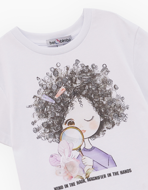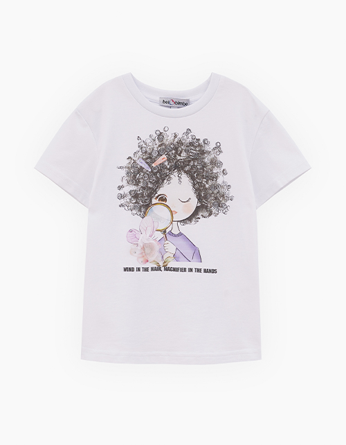 Дизайнерская белая футболка для девочки. Прямая модель. Эластичная горловина. Футболка с авторским принтом декорирована стразами и нашивным элементом из сеточки.