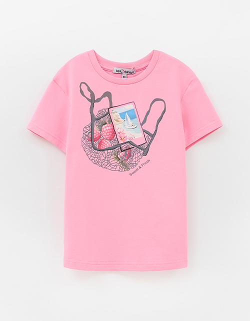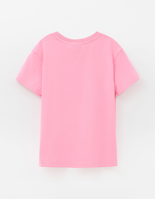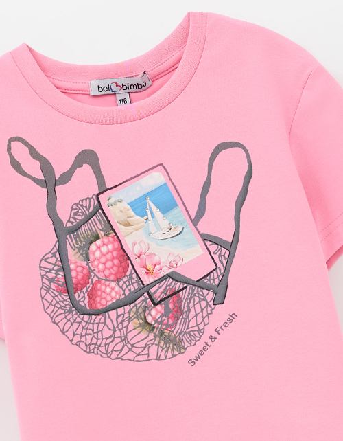 Розовая футболка для девочки. Прямой силуэт обеспечивает комфорт. Короткий рукав и эластичная горловина из рибаны формируют аккуратную посадку. Модель без застёжки выполнена из кулирной глади. Цифровой принт дополнен DTF?плёнкой и стразами.