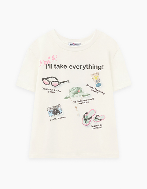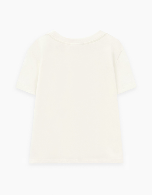 Футболка молочного цвета для девочки. Прямой силуэт обеспечивает комфорт. Короткий рукав и эластичная горловина из рибаны формируют аккуратную посадку. Цифровой принт дополнен термотрансферной плёнкой.