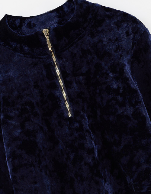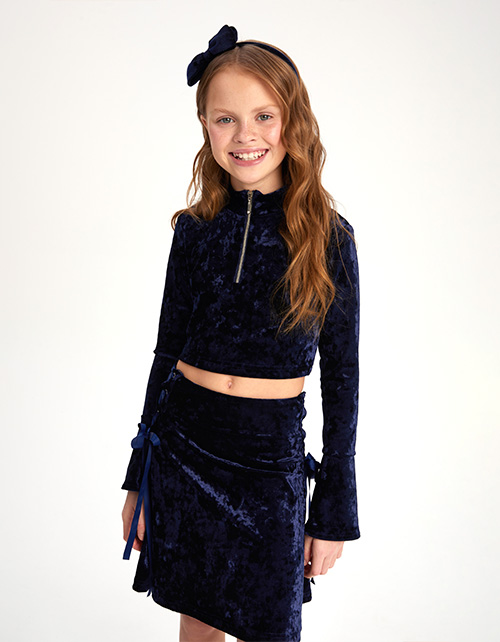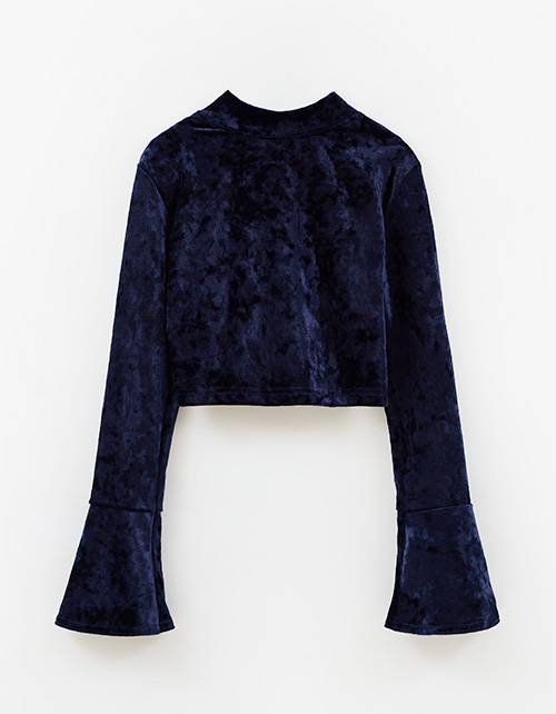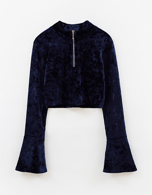 Стильный кроп-топ для девочки из мягкого бархата глубокого синего цвета. Прямой силуэт, длинный расклешённый рукав. Высокая горловина. Застёжка на молнию спереди. Эффектный акцент для стильных образов и особых случаев.