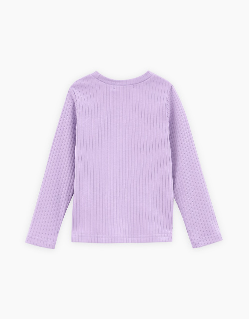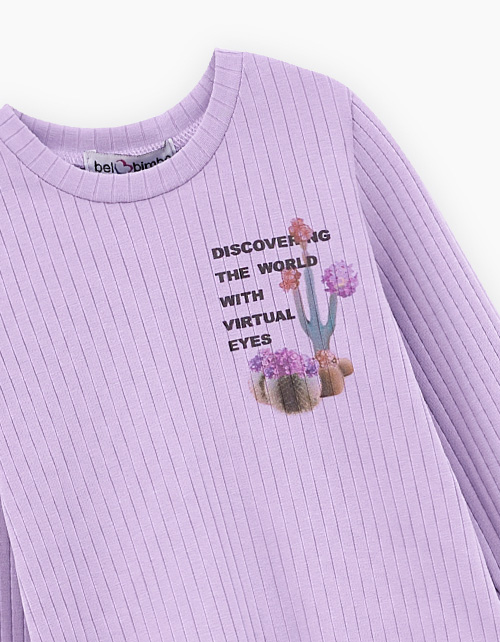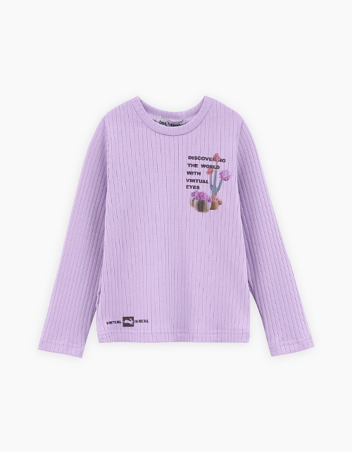 Лонгслив приятного лавандового оттенка для девочки. Модель прилегающего силуэта. Эластичная горловина. Трендовый материал кашкорсе тактильно приятный к телу. Лонгслив декорирован авторскими принтами.