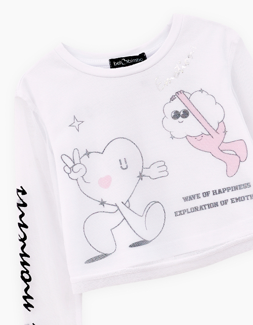 Белый лонгслив для девочки. Укороченная модель комфортного прямого силуэта. Эластичная горловина. Комбинация материалов: мягкая сетка и кулирная гладь. Лонгслив декорирован авторским принтом, и серебряной плёнкой.