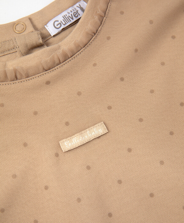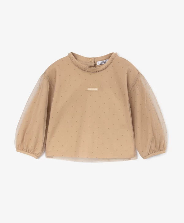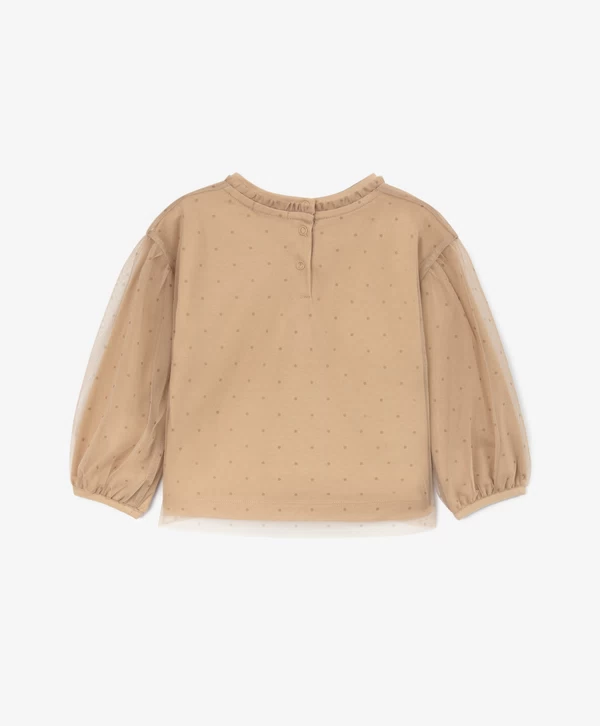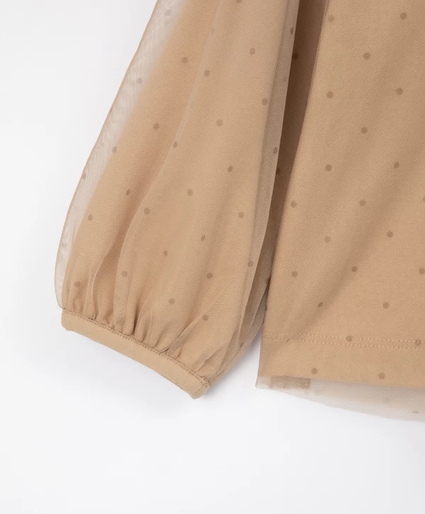 Невероятное сочетание плотного трикотажа и лёгкой сетки, которое точно понравится малышке! Бежевый лонгслив с объёмными рукавами и спущенной линией плеча смотрится очень стильно благодаря необычному дизайну, который отражает тренд на многослойность. Нижний слой выполнен из мягкого, эластичного и формоустойчивого интерлока, верхний — из нежной сетки в горошек. В оформлении изделия используется фирменная жаккардовая нашивка.