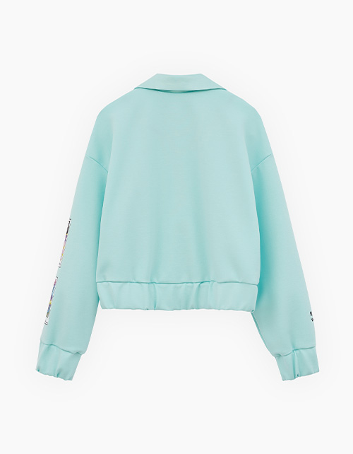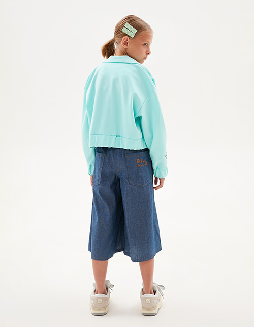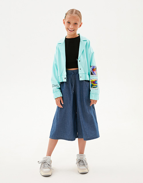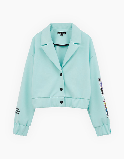 Жакет-бомбер в освежающем оттенке морской бриз для девочки. Прямая укороченная модель. Спущенная линия плеча. Манжеты и низ изделия на мягкой резинке. Застёжка на контрастные кнопки. Жакет декорирован авторскими принтами, устойчивая DTF-печать.