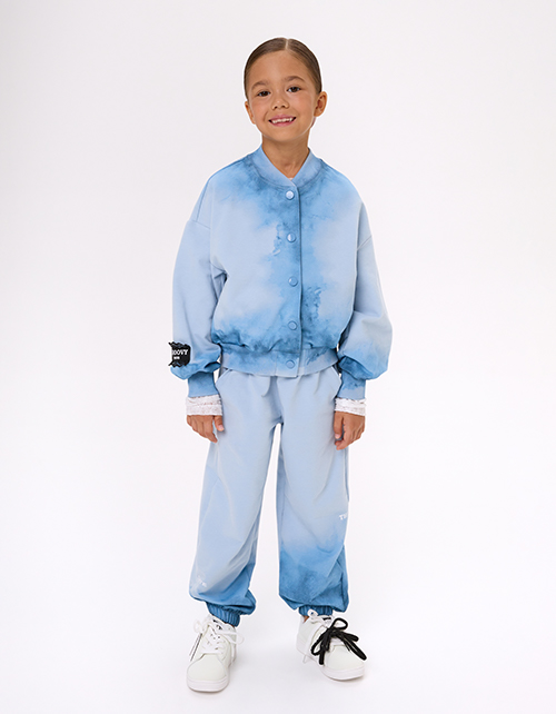 Жакет-бомбер из мягкого материала с комфортным объёмом и приспущенной линией плеча. Эластичная рибана по низу и манжетам обеспечивает удобную посадку. Карманы в шве. Цифровой принт, термоплёнка и кружевной декор добавляют выразительности.