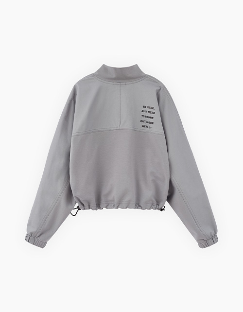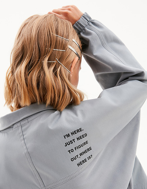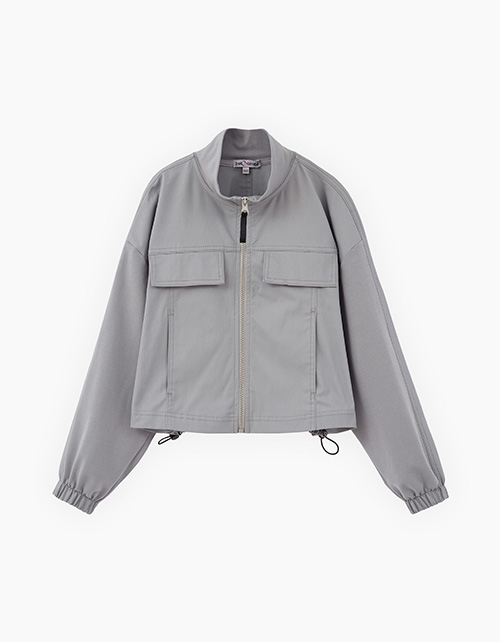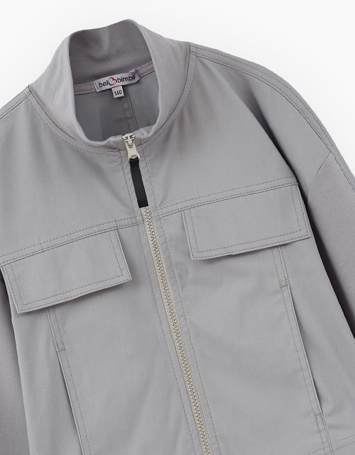 Утилитарный жакет серо-зелёного оттенка для девочки. Прямая укороченная модель. Воротник-стойка. Спущенная линия плеча. Манжеты на мягкой резинке. Комбинация материалов: футер и твил. Жакет декорирован декоративными строчками и шрифтовым принтом.