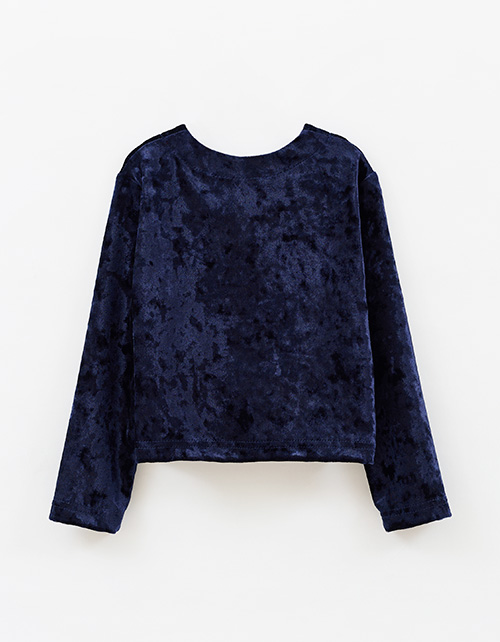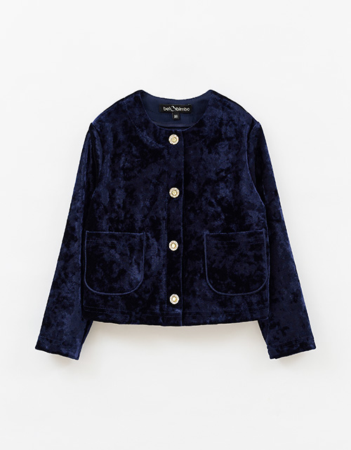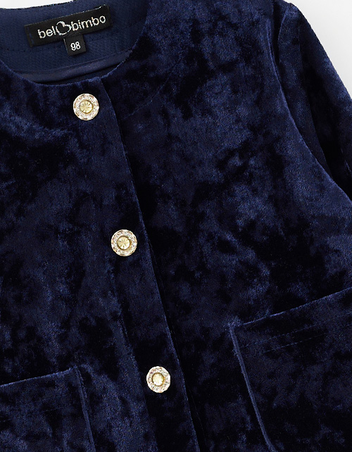 Элегантный жакет для девочки из мягкого бархата глубокого синего цвета. Прямой силуэт, длинный рукав. Круглый вырез горловины. Декоративные карманы. Застёжка на кнопки с блестящим декором. Подходит для особых случаев и стильных образов.