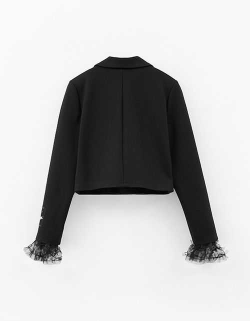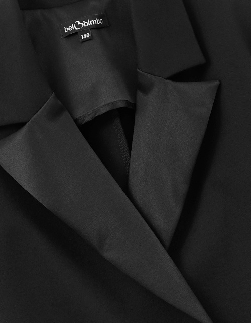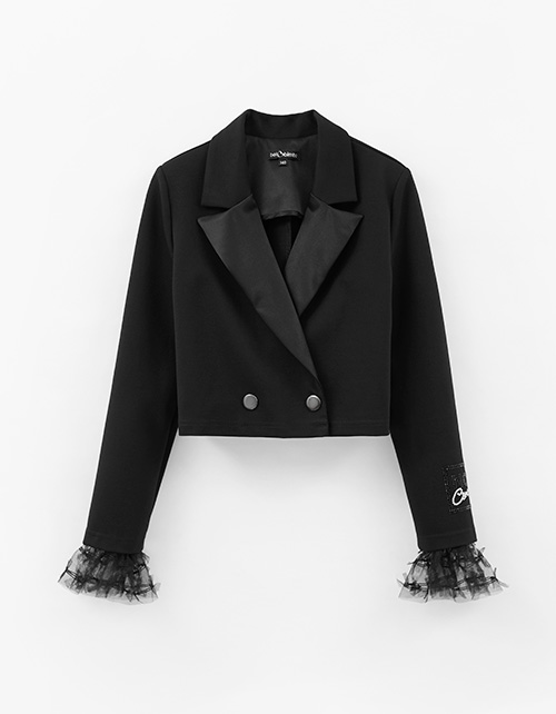 Трендовый чёрный жакет с плечиками для девочки. Прямая укороченная модель. Сатиновые лацканы и воротник. Ажурные съёмные манжеты. Застёжка на кнопки. Жакет декорирован авторской термоаппликацией из страз.