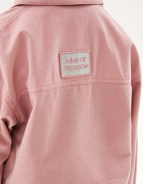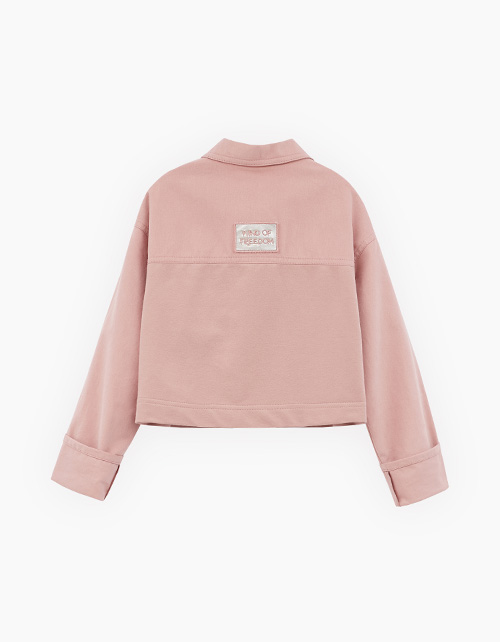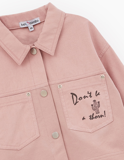 Трендовый жакет-джуда пепельно-розового оттенка для девочки. Укороченная прямая модель. Спущенная линия плеча. Накладные карманы. Комфортная застёжка на кнопки. Комбинация материалов: тактильно приятный футер и твил. Джуда декорирована авторской вышивкой.