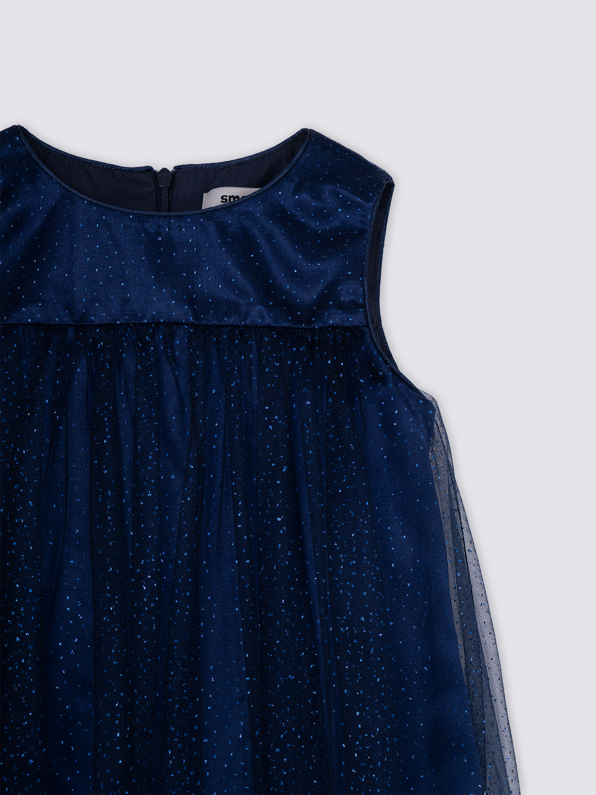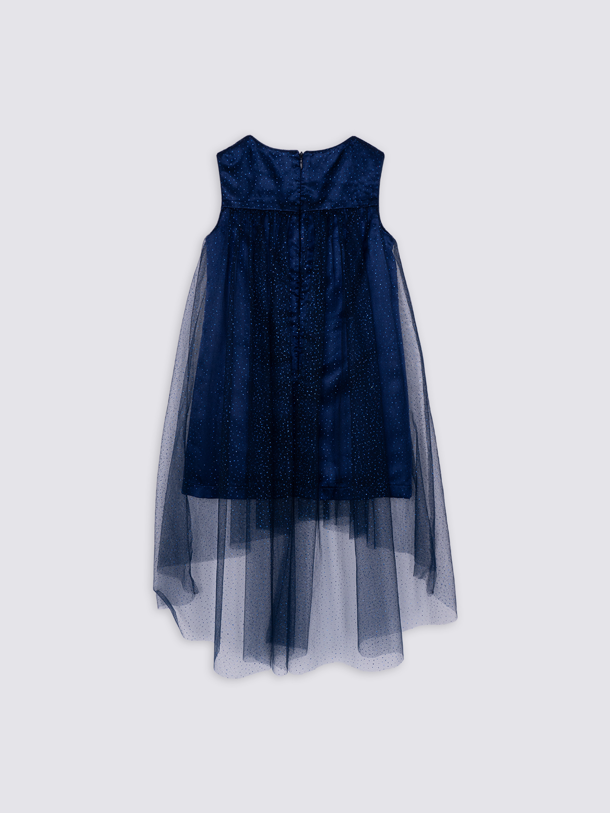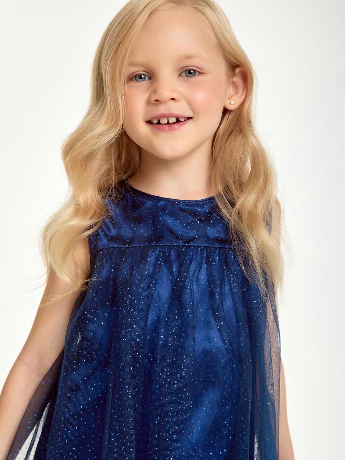 Нарядное платье с кокеткой на груди А-силуэта из гладкого атласа с подкладкой идеально подойдёт для особых случаев. Верх модели драпирован сеткой с блёстками, которая создаёт лёгкое сияние и праздничное настроение. Удлинённая спинка добавляет изысканности и подчёркивает элегантный силуэт.