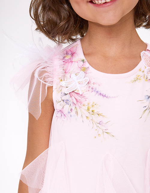 Дизайнерское платье для особого случая в ярком оттенке для девочки. Летящий А-образный силуэт из лёгкой ткани создаёт воздушность. Плечики с декоративными перьями, вышитые элементы с пайетками и пуговичка на спинке добавляют сияния.