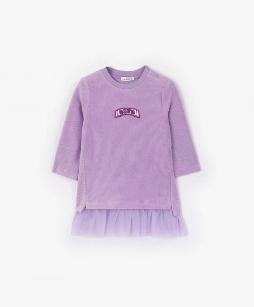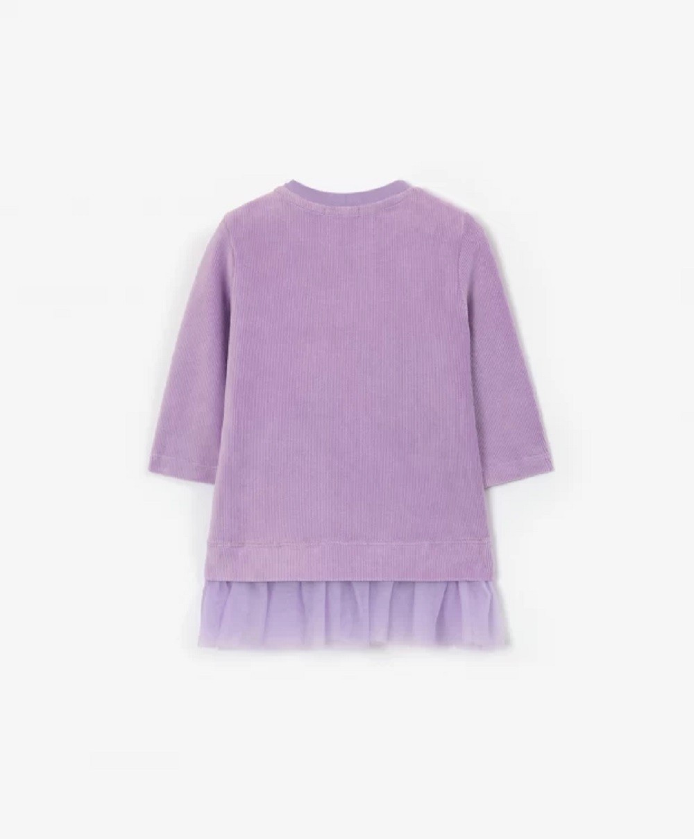 Стильное платье сделает осенний гардероб ребенка комфортным и интересным. Выполненное из велюрового трикотажного полотна с эластаном в мелкий рубчик, платье обладает особой пластикой, мягкостью, тактильной притягательностью. Трапециевидная форма, подчеркнутая присборенной юбкой из сетки, делает изделие очень женственным и нежным. В оформлении платья использована деликатная нашивка с флоковыми шрифтовыми элементами. Платье имеет застежку на плечевом шве(кнопки) для удобной эксплуатации изделия.