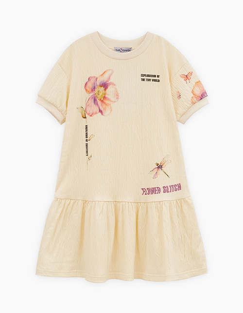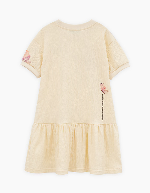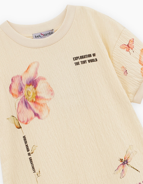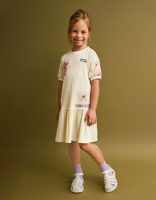Лёгкое платье для девочки. Модель комфортного А-силуэта. Спущенная линия плеча. Изделие из материала с эффектом "жатости", не требующего глажки. Платье декорировано акцентным авторским принтом.