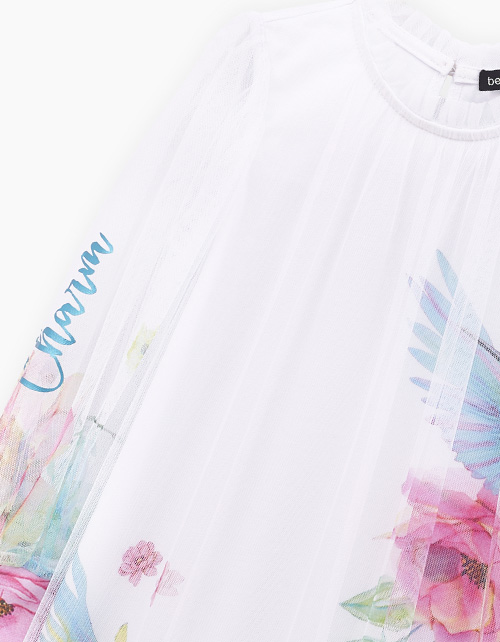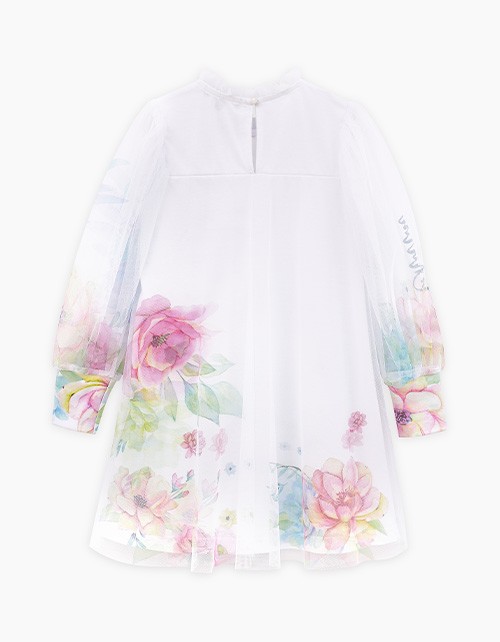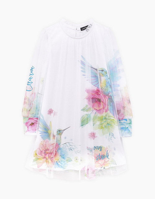 Воздушное платье для девочки. Модель комфортного летящего А-образного силуэта. Высокие эластичные манжеты из рибаны. Платье выполнено из мягкой сетки и кулирной глади с авторским принтом. Дополнено блестящей плёнкой.