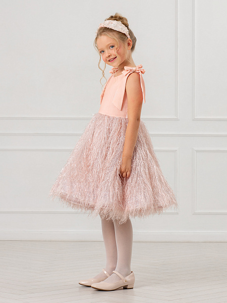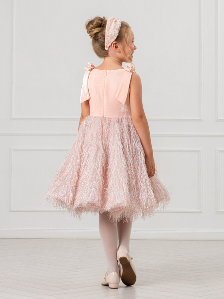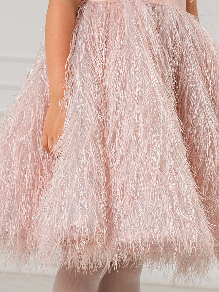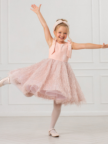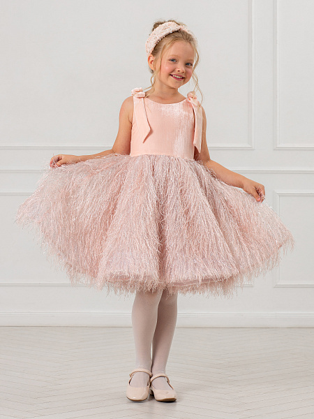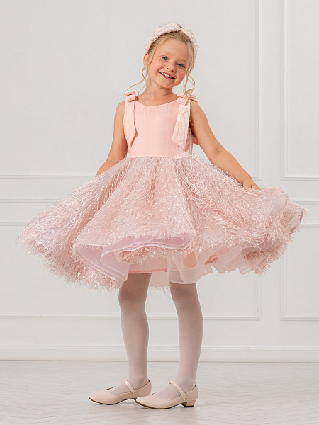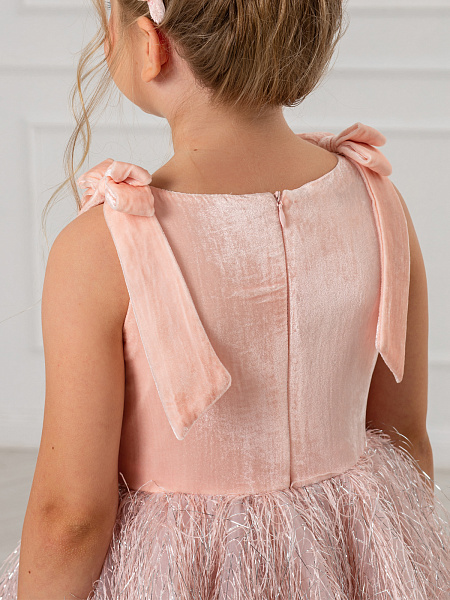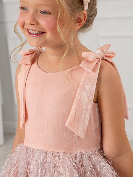 Роскошное бархатное платье для девочки в розовом цвете. Изысканная ткань, состоящая из вискозы и нейлона, создаёт благородный блеск и приятную текстуру. Главная особенность модели — пышная юбка, украшенная мерцающим люрексом и изящными перьями, которые добавляют платью торжественности. Банты на плечах придают образу утончённость. Комфорт обеспечивает подкладка из 100% хлопка, а удобная застёжка-молния на спинке позволяет легко надевать и снимать платье. В комплект входит ободок с пайетками в тон платью, который завершает праздничный образ. Это платье станет идеальным выбором для особых случаев: дней рождения, утренников, фотосессий и других торжественных мероприятий.