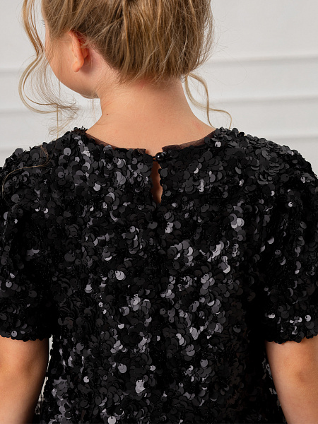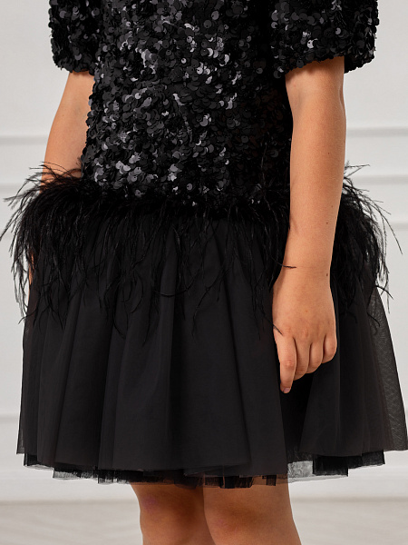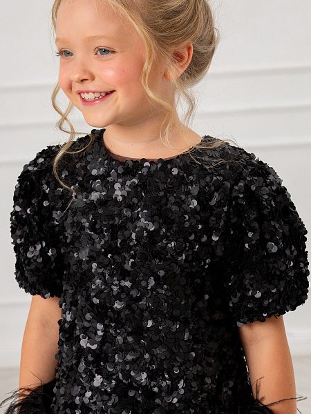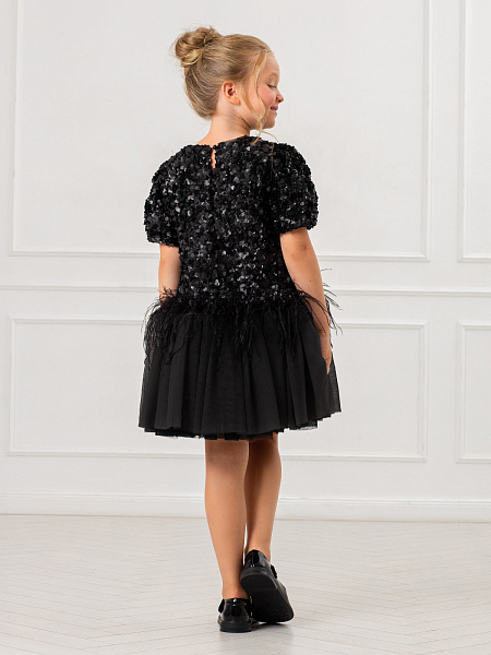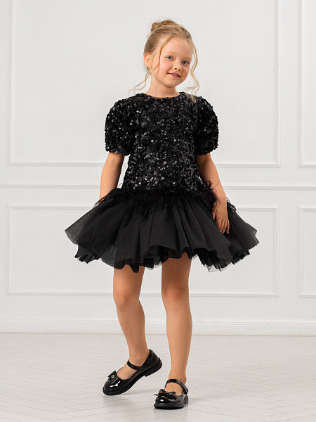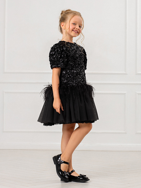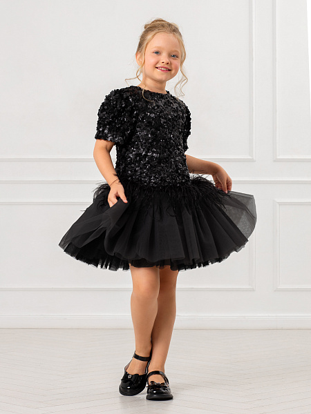 Нарядное платье длядевочки в благородном черном цвете. Модель привлекает внимание блестящей отделкой из пайеток, которые красиво переливаются при движении. Изящный А-силуэт и романтичные рукава-фонарики создают элегантный образ. Особую изюминку платью придаёт нижняя часть юбки из лёгкой сетки с изящными перьями. Комфортная посадка обеспечивается удобной застёжкой-молнией на спинке. Сочетание материалов делает платье практичным: верх выполнен из прочного 100% полиэстера, а внутренняя подкладка — из мягкого хлопка, который приятен к телу. Это платье станет идеальным выбором для праздников, утренников и других торжественных мероприятий. В нём ваша малышка будет чувствовать себя настоящей принцессой!
