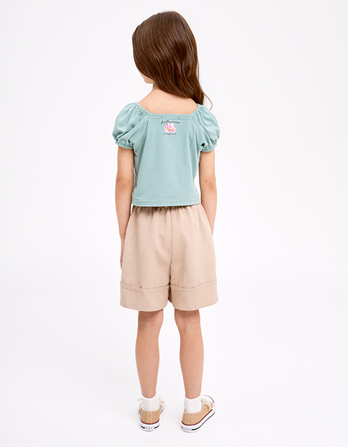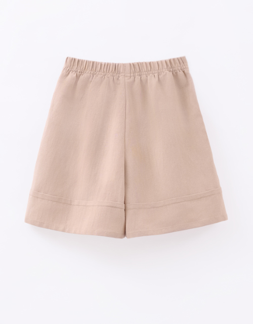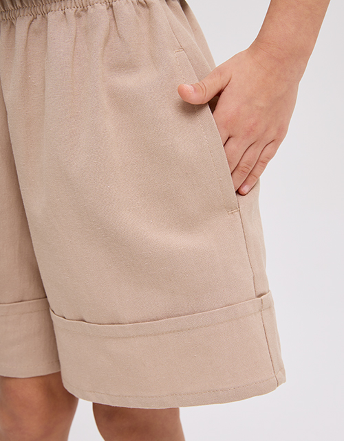 Льняные шорты в светло-коричневом оттенке с прямым, широким силуэтом создают лёгкий, солнечный образ. Средняя посадка и пояс с мягкой эластичной лентой обеспечивают комфорт. Карманы в шве делают модель практичной для прогулок и отдыха.