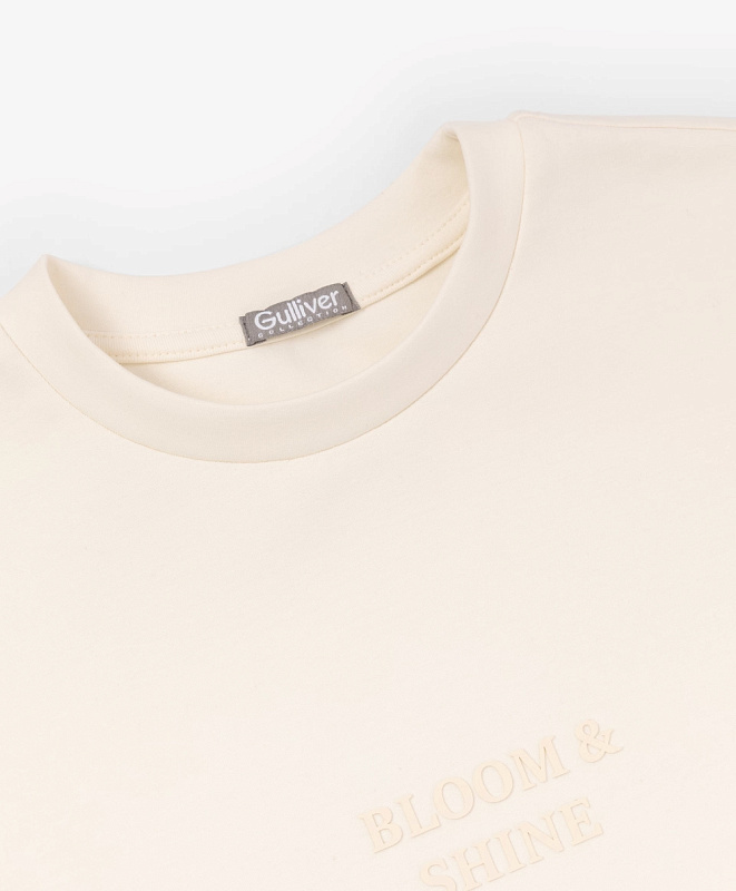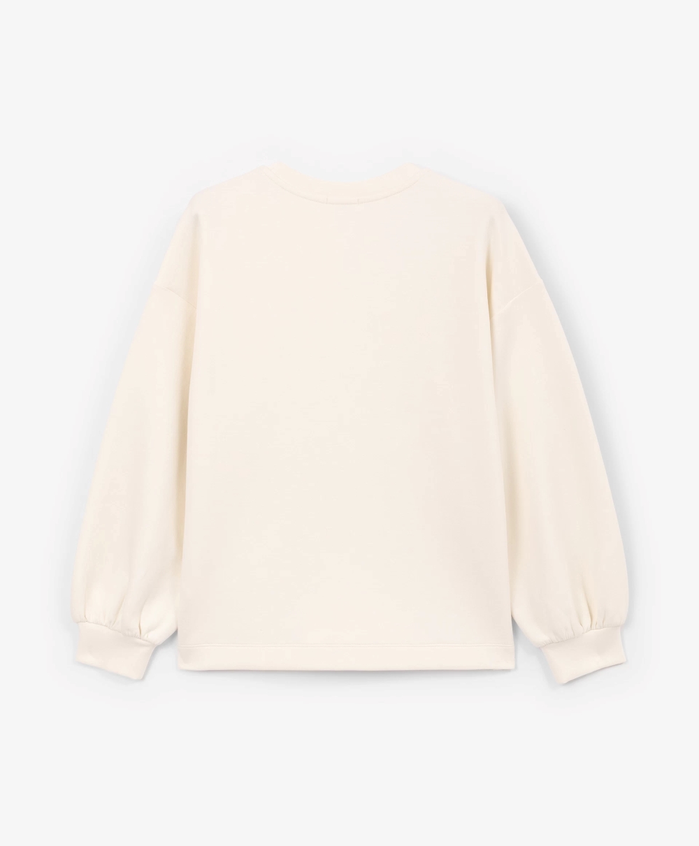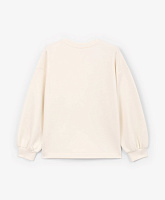 Свитшот благородного молочного цвета силуэта умеренный оверсайз – стильный базовый элемент осеннего гардероба девочки. Свитшот выполнен из мягкого хлопкового интерлока, дополненного рибом на О-образной горловине и манжетах. В оформлении модели использован неброский шрифтовой принт на передней части.