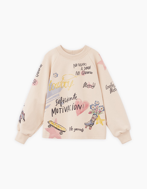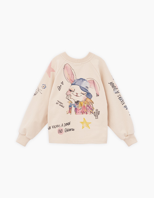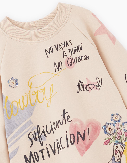 Светло-бежевый свитшот для девочки. Прямая объёмная модель. Манжеты и горловина из эластичной рибаны. Свитшот выполнен из тактильно приятного материала с бархатистым эффектом. Изделие декорировано авторскими принтами и стразами.