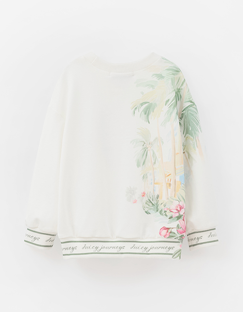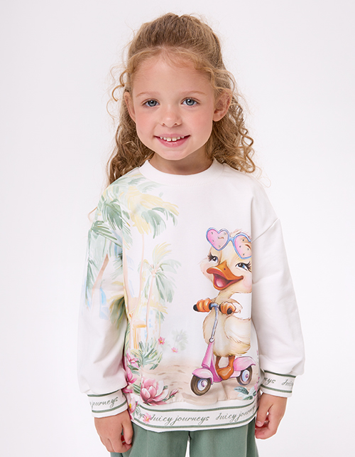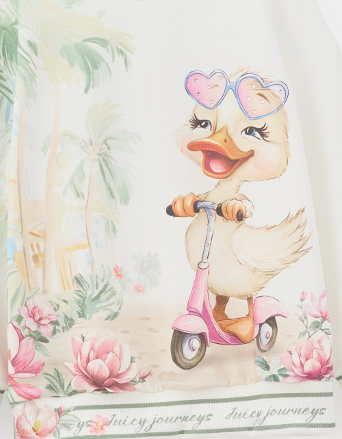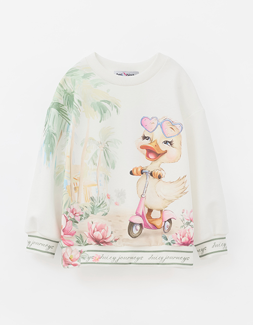Свитшот из футера выполнен в модной О-образной конструкции с объёмом по низу на эластичной рибане. Почерковый принт и стразы создают яркий акцент. Длинный рукав и мягкая обработка из рибаны обеспечивают комфорт, сохраняя солнечное настроение модели.