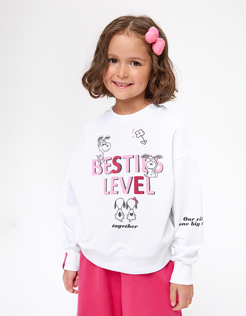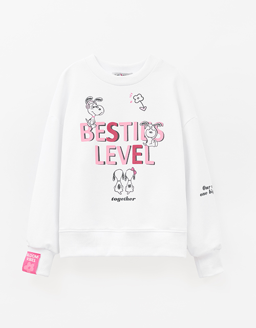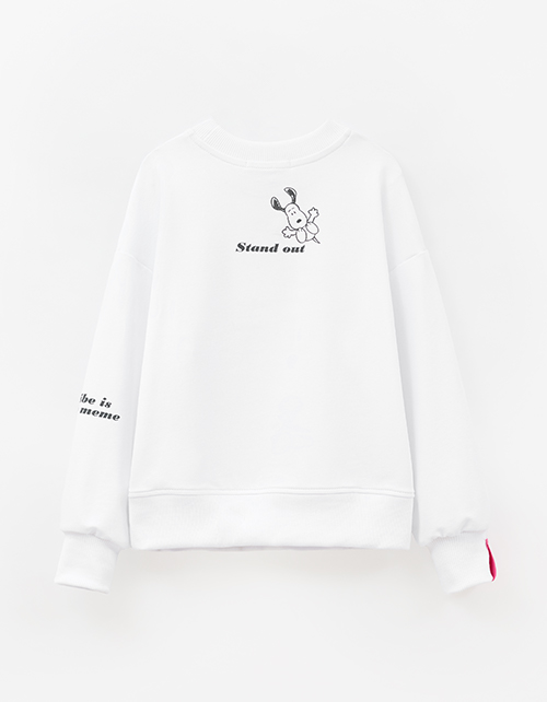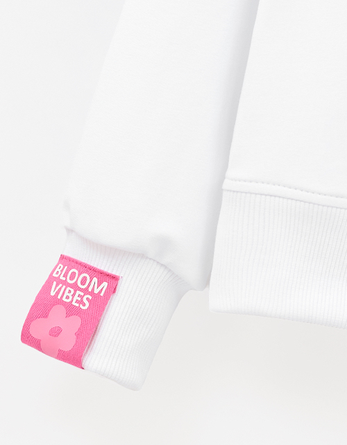 Объёмный белый свитшот с приспущенной линией плеча декорирован авторским цифровым принтом, дополненным термо? и бархатной плёнкой. Мягкий низ на рибане создаёт комфортный силуэт, а нашивной элемент из киперной тесьмы добавляет стильный акцент.