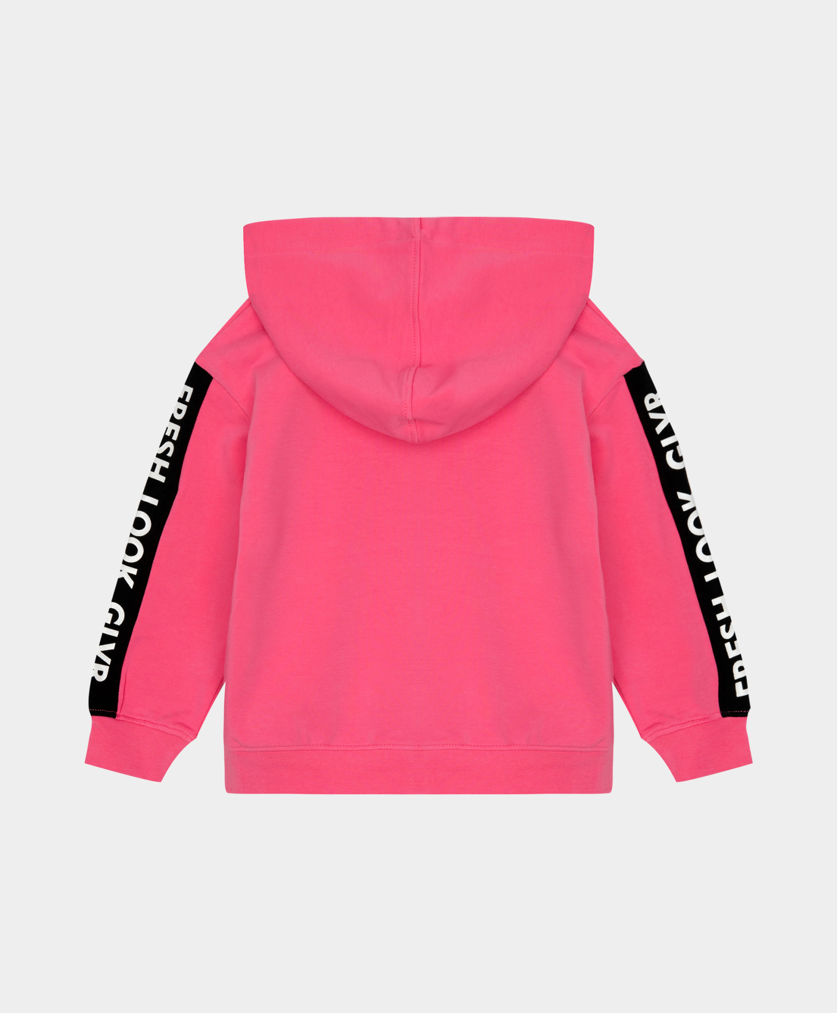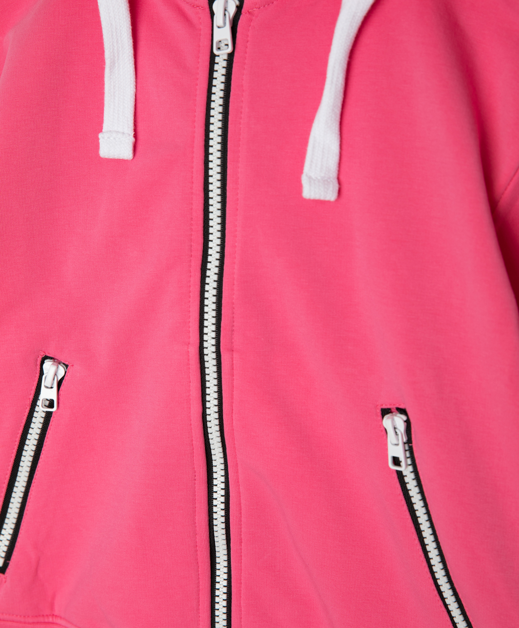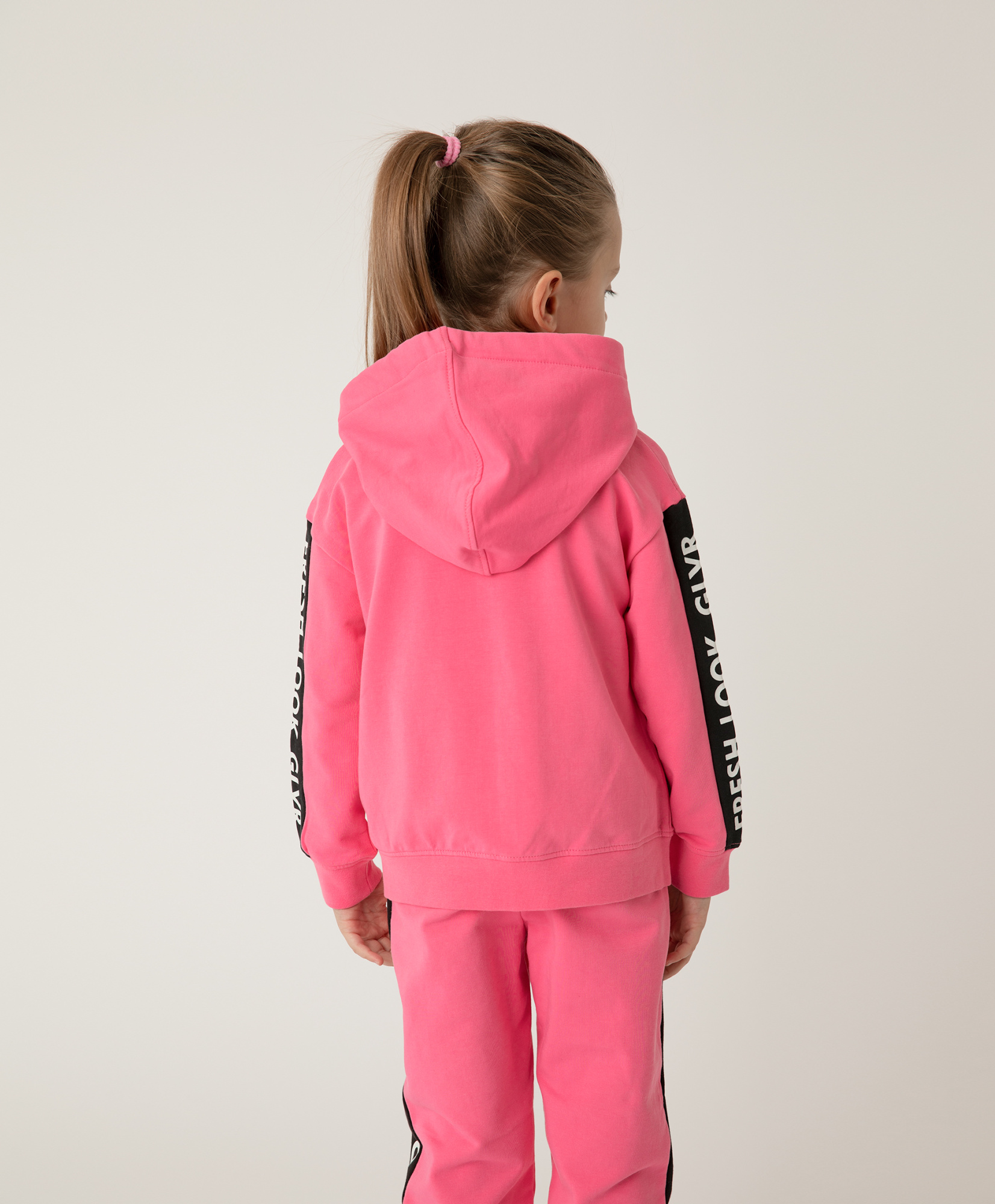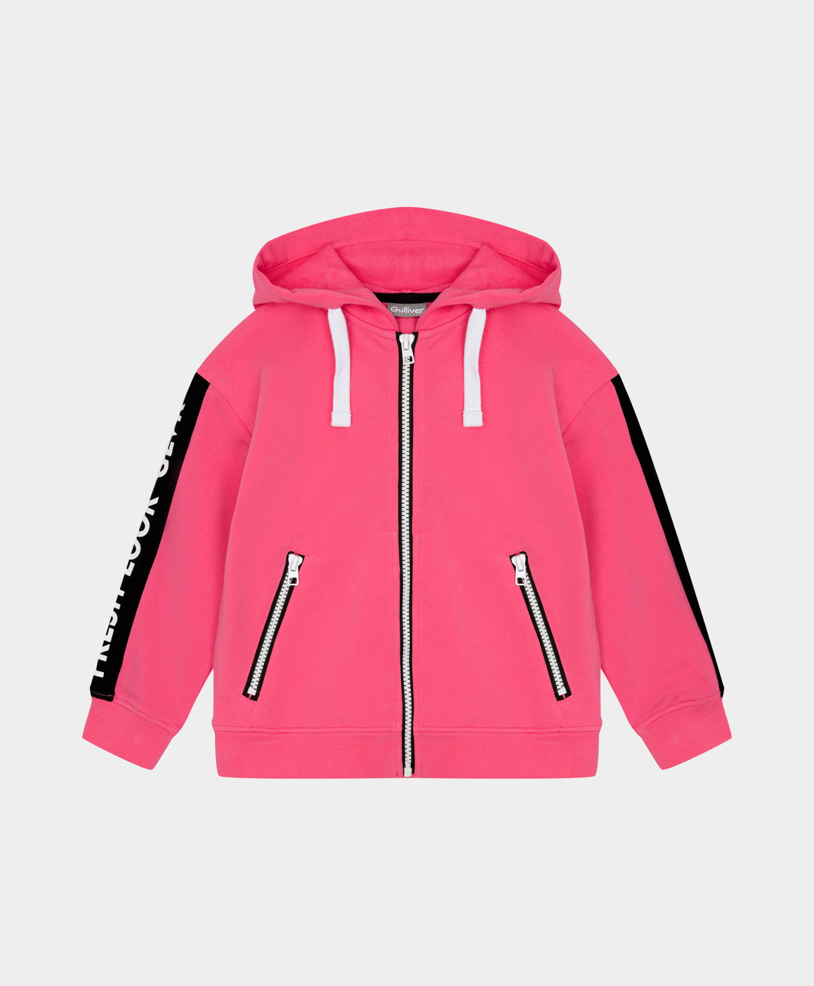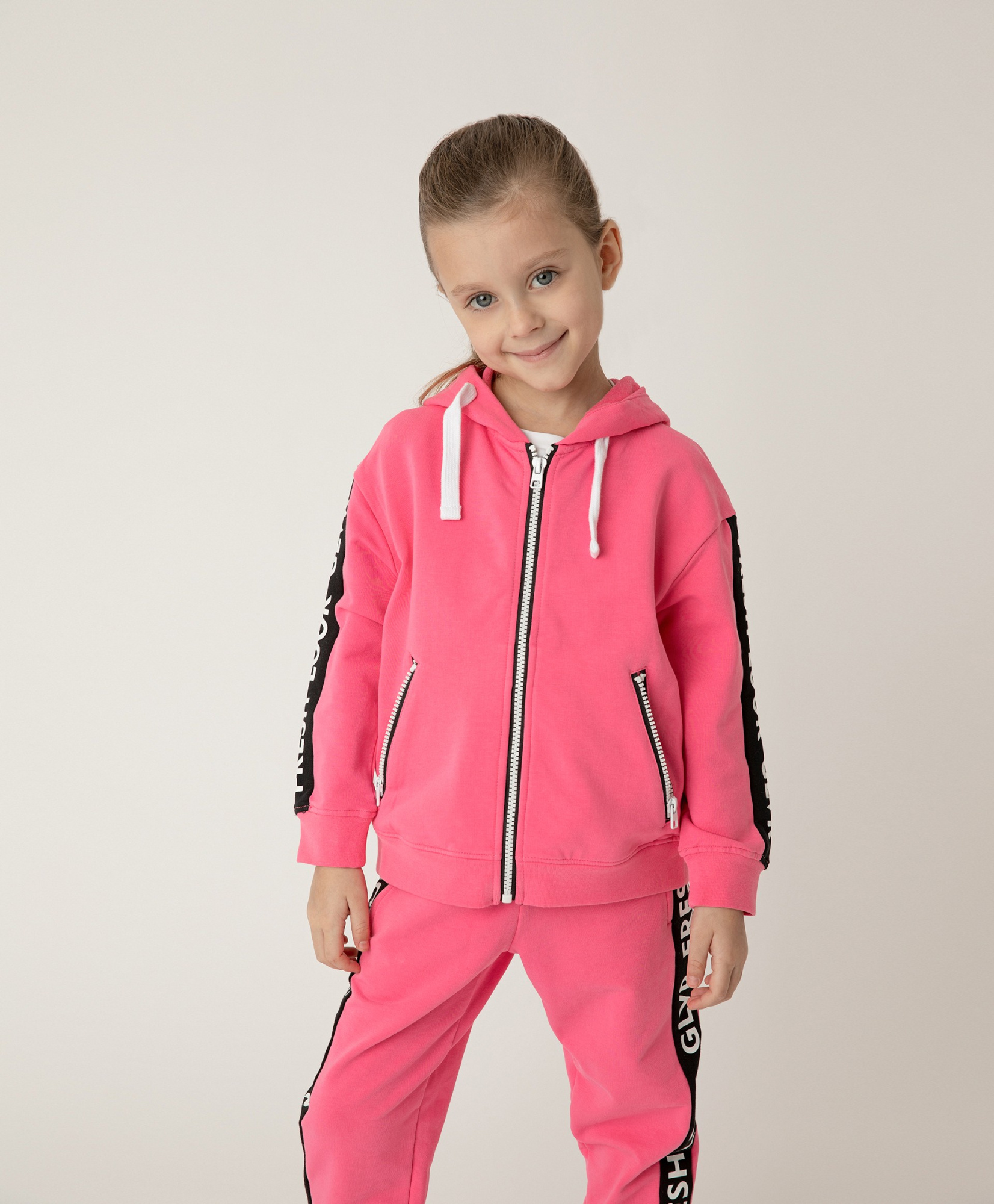 Классная фуксийная толстовка с капюшоном – отличный компаньон к брюкам, шортам, юбке. Ее шик – в простоте. Яркий цвет, модный силуэт оверсайз, правильные пропорции и эффектная контрастная отделка жаккардовой тесьмой на рукавах, сделают изделие хитом летнего гардероба энергичной современной девочки, ценящей стиль, комфорт и модные тренды.