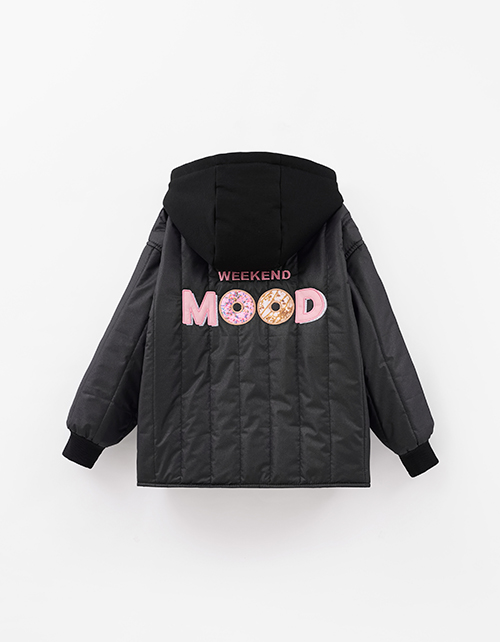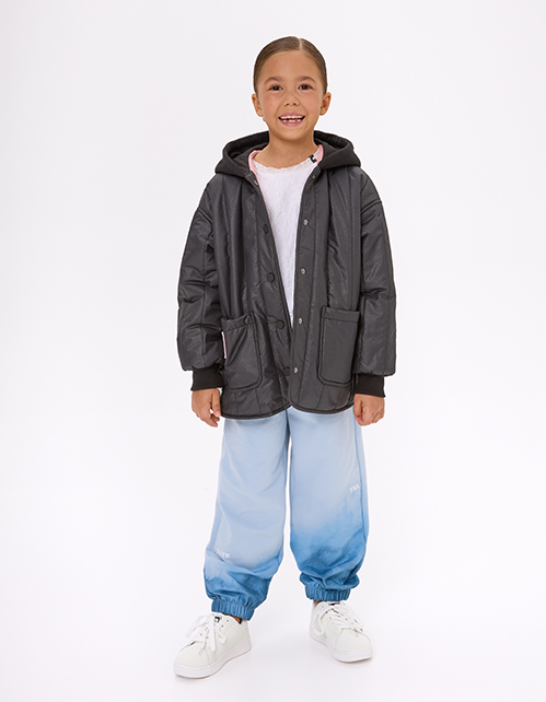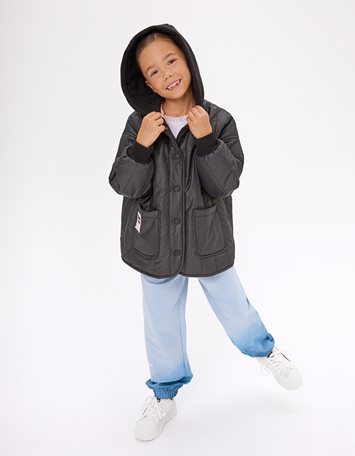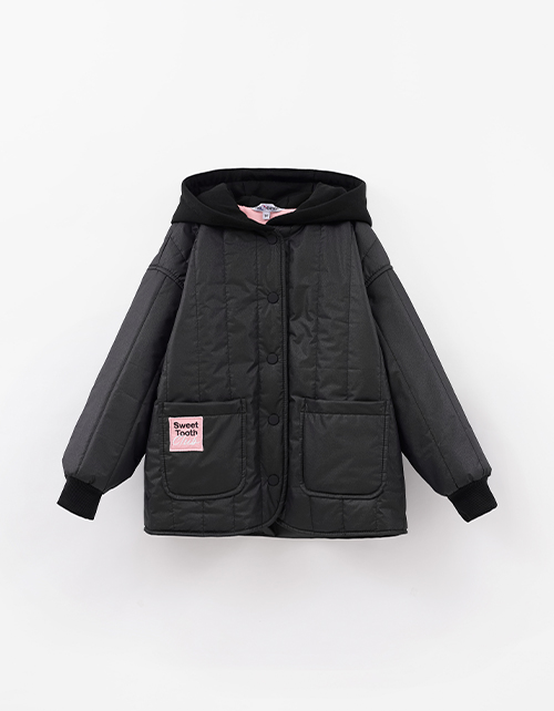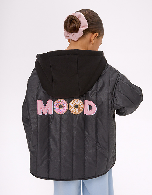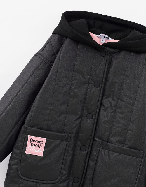 Стёганая чёрная куртка на гипоаллергенном синтепоне. Прямой силуэт из плащевой ткани с эффектом кожи и контрастной хлопковой подкладкой. Стёганое полотно, мягкий футровый капюшон, накладные карманы, кнопки. Мягкие эластичные манжеты. Рекомендовано от +5.