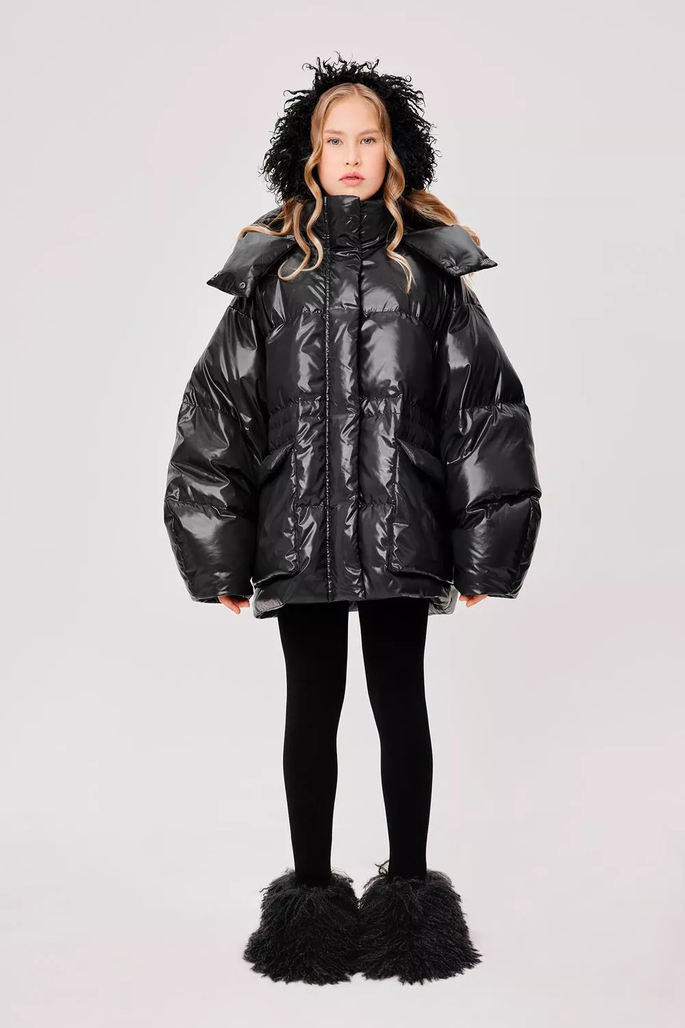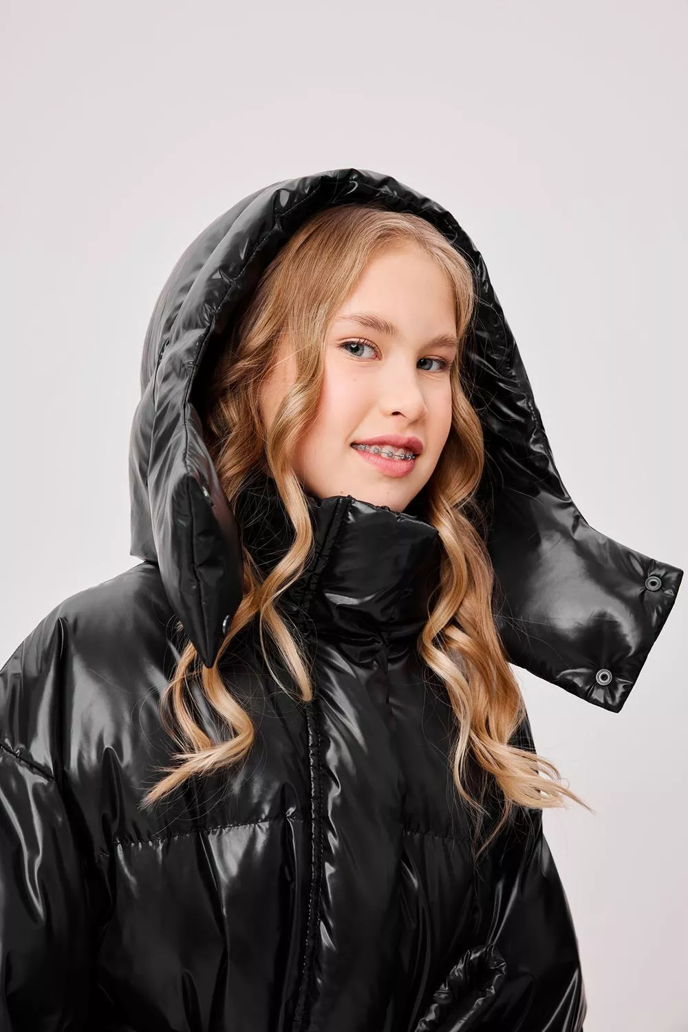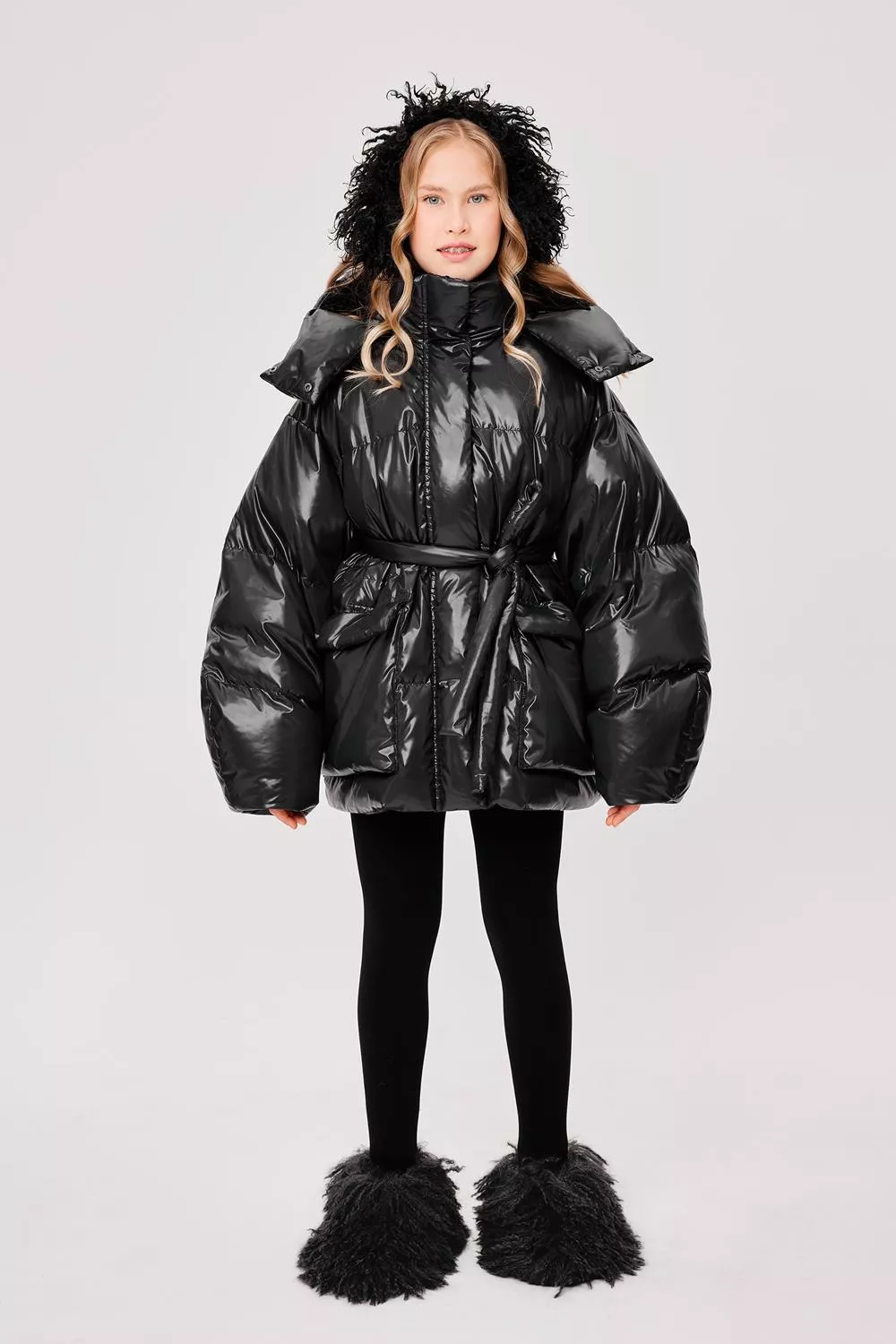 Куртка свободного прямого силуэта. Застежка – центральная на молнию, с верхней ветрозащитной планкой на потайных кнопках. Рукав втачной, со спущенной мягкой линией плеча. Воротник-стойка. Капюшон-шлем, застегивающийся на потайные кнопки. На переде объёмные накладные карманы с клапаном. По талии обработана кулиса, регулируемая со стороны подклады стопорами и шнуром-резинкой. Изделие стегано крупными горизонтальными переборками. Округлая 3-D форма рукава создана за счет вытачек. Внутри рукав оформлен трикотажными манжетами. Капюшон съемный, пристегивается на молнию. Край капюшона-с объемной кулисой, регулируемой шнуром-резинкой и стопорами. С помощью кулисы по талии и съемного пояса возможна трансформация силуэта.