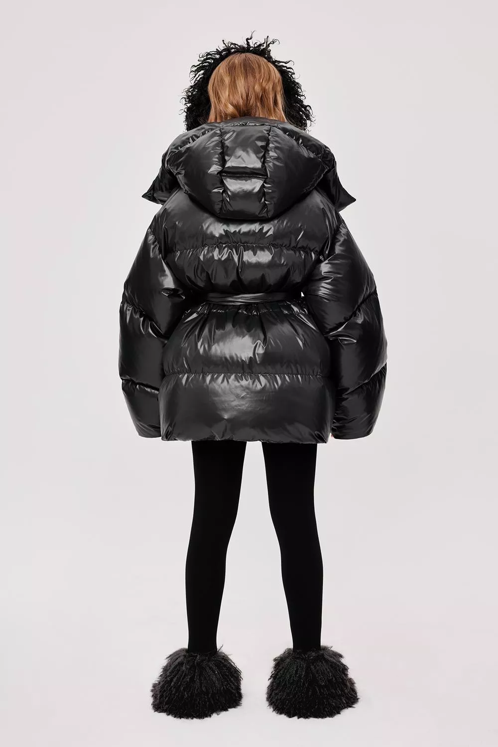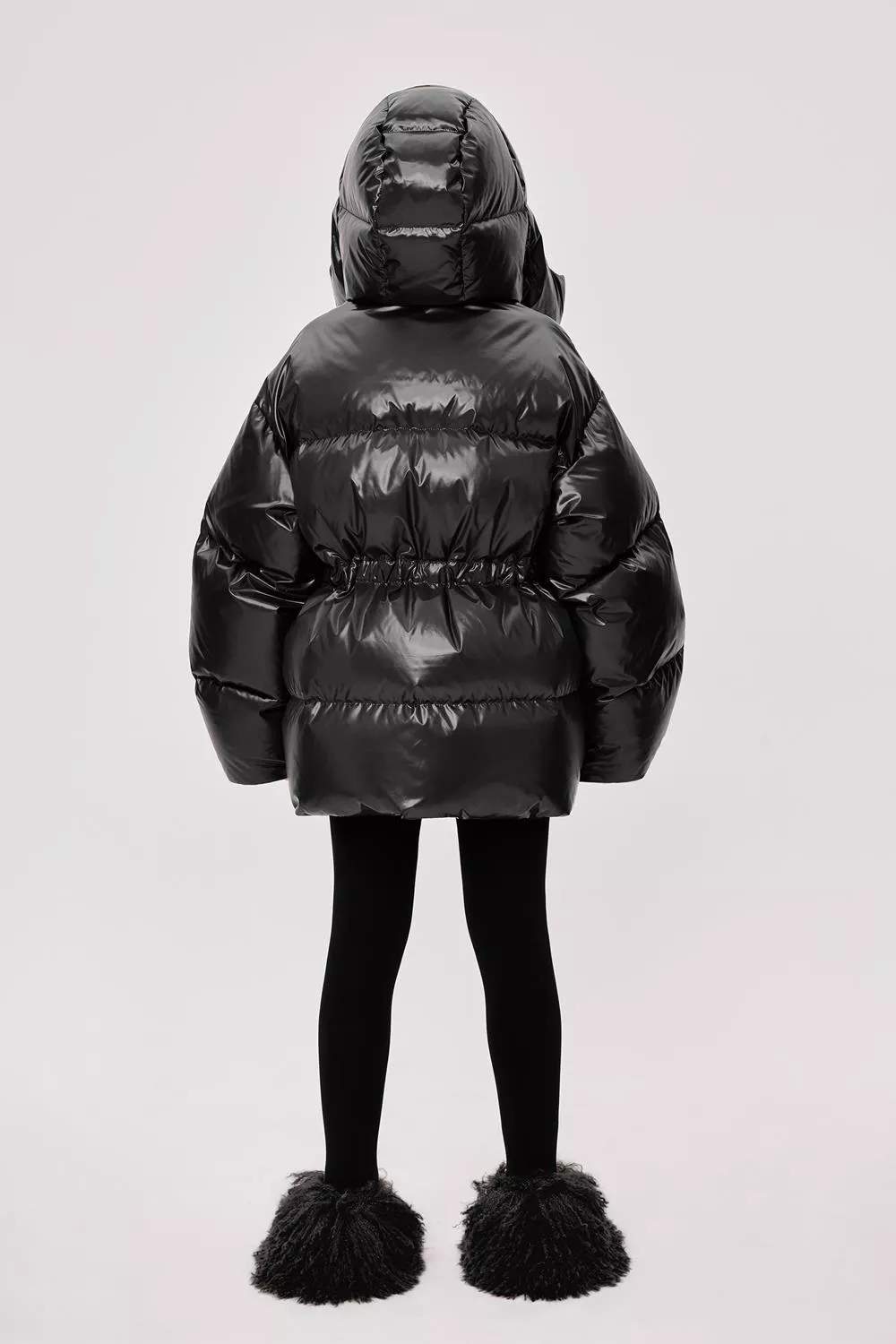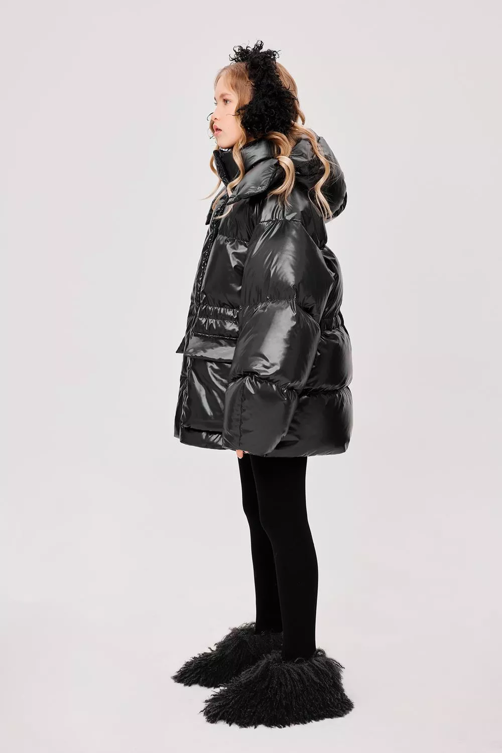 Куртка свободного прямого силуэта. Застежка – центральная на молнию, с верхней ветрозащитной планкой на потайных кнопках. Рукав втачной, со спущенной мягкой линией плеча. Воротник-стойка. Капюшон-шлем, застегивающийся на потайные кнопки. На переде объёмные накладные карманы с клапаном. По талии обработана кулиса, регулируемая со стороны подклады стопорами и шнуром-резинкой. Изделие стегано крупными горизонтальными переборками. Округлая 3-D форма рукава создана за счет вытачек. Внутри рукав оформлен трикотажными манжетами. Капюшон съемный, пристегивается на молнию. Край капюшона-с объемной кулисой, регулируемой шнуром-резинкой и стопорами. С помощью кулисы по талии и съемного пояса возможна трансформация силуэта.