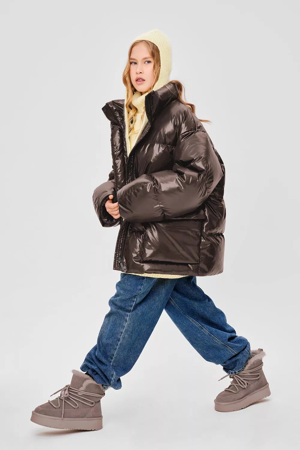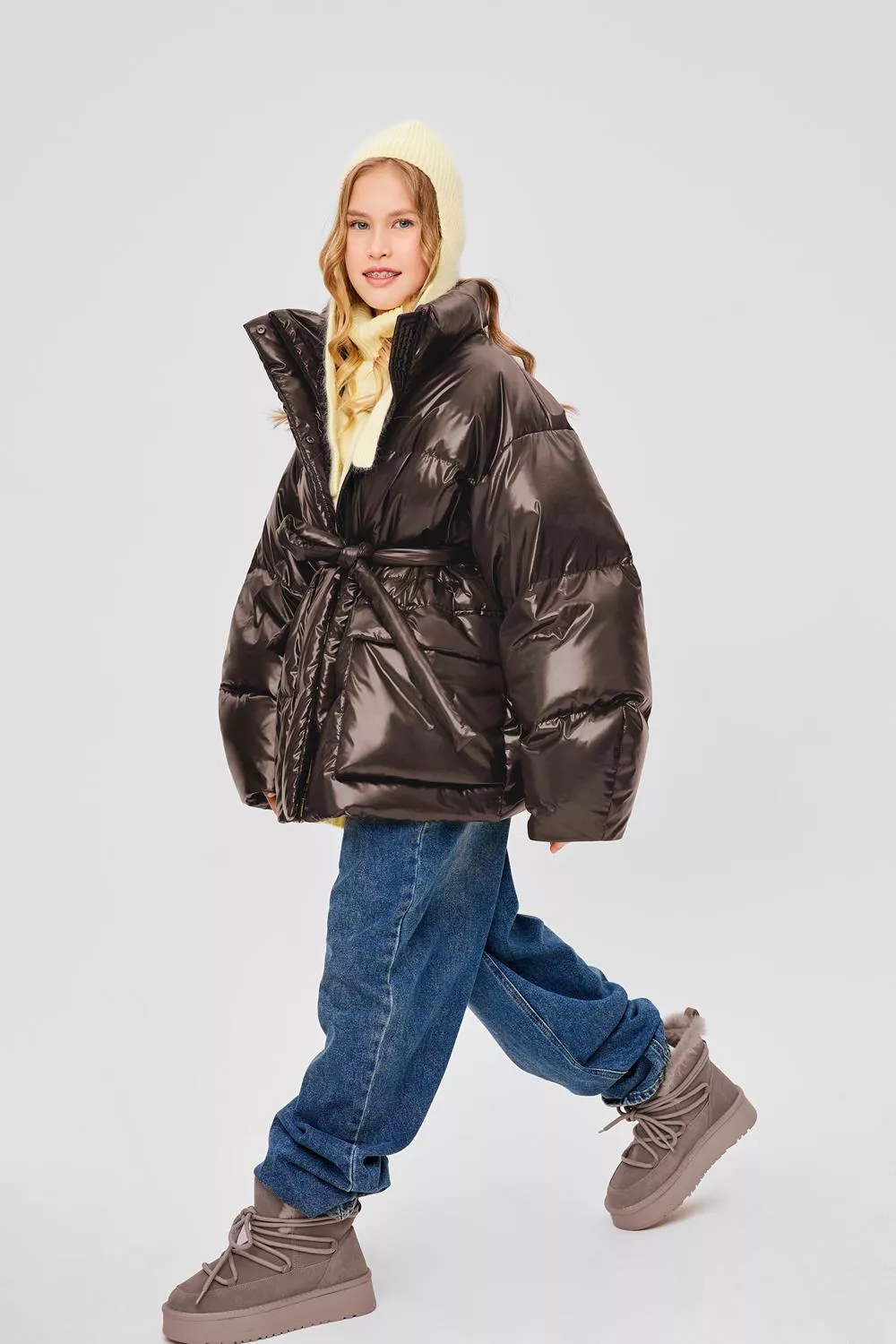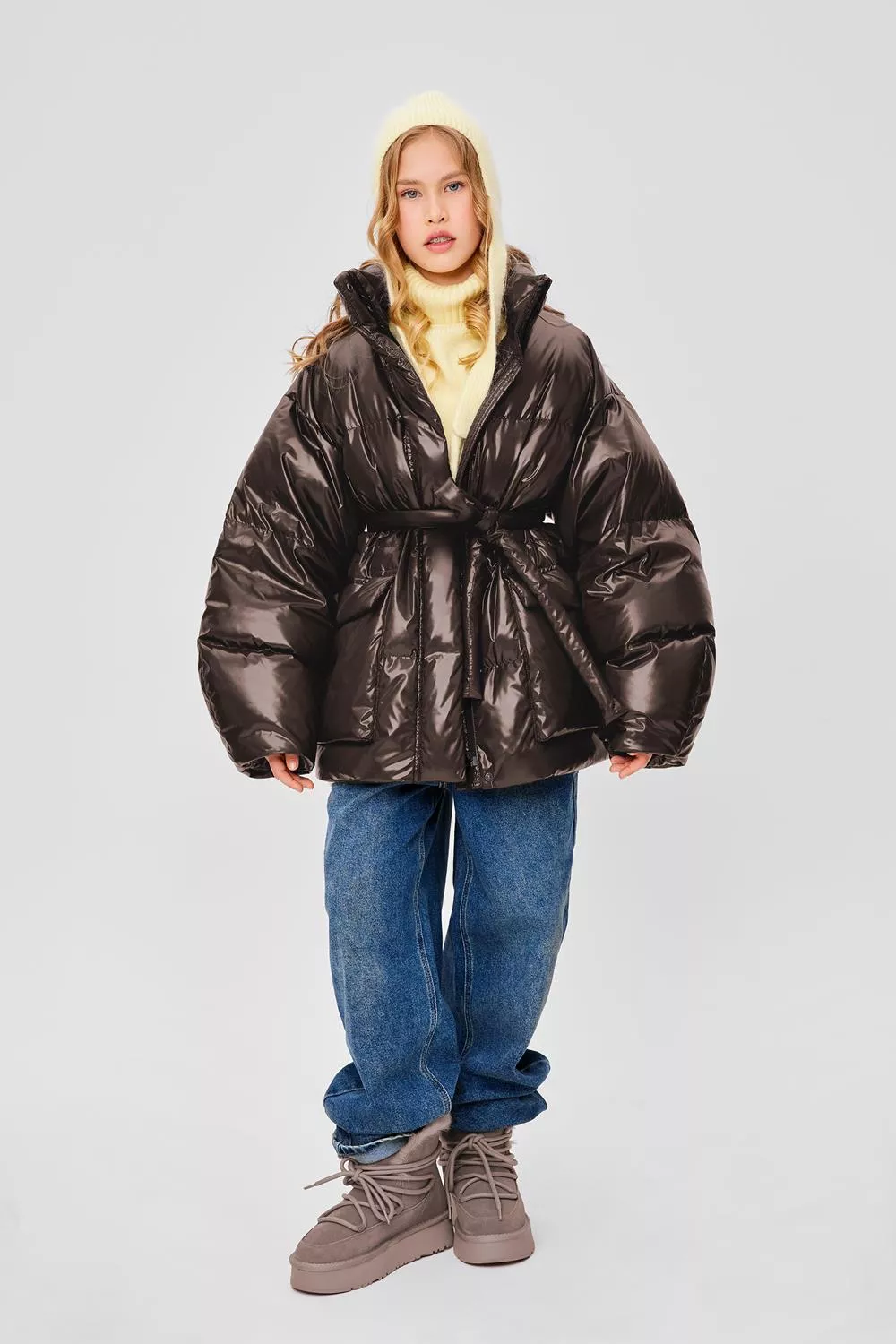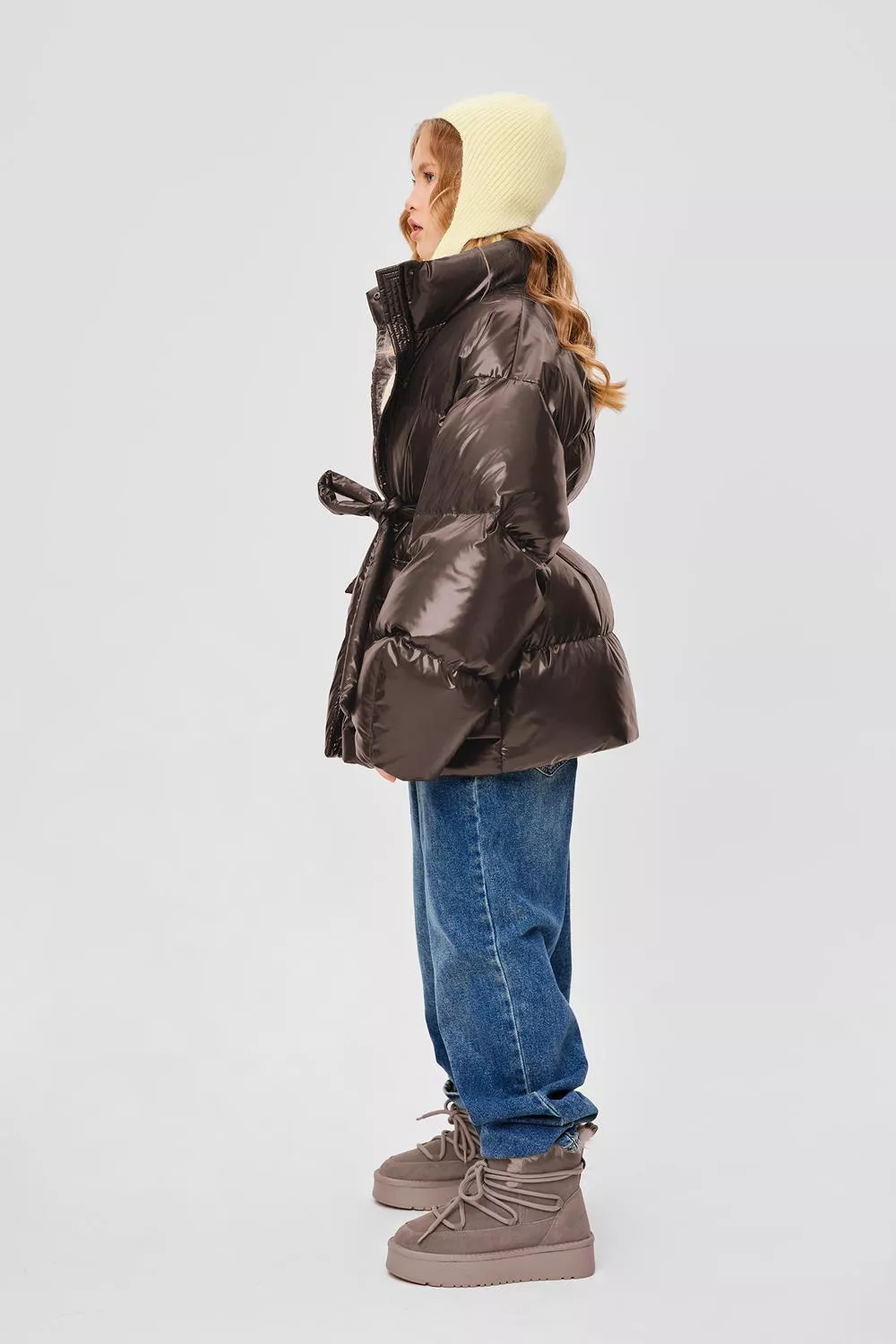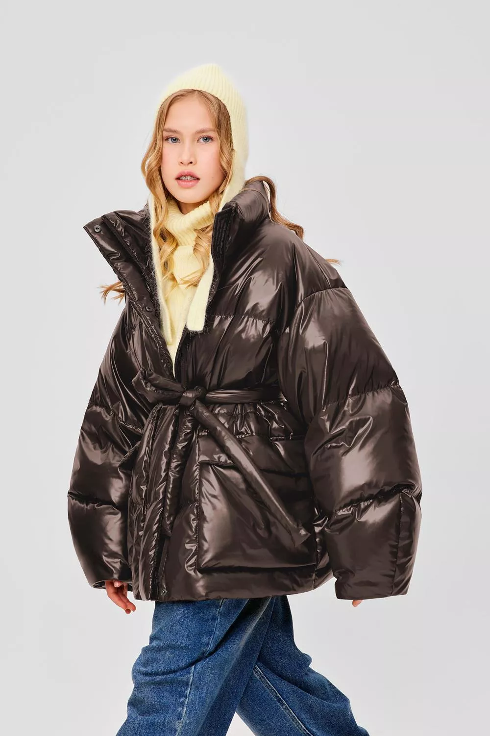 Куртка свободного прямого силуэта. Застежка – центральная на молнию, с верхней ветрозащитной планкой на потайных кнопках. Рукав втачной, со спущенной мягкой линией плеча. Воротник-стойка. Капюшон-шлем, застегивающийся на потайные кнопки. На переде объёмные накладные карманы с клапаном. По талии обработана кулиса, регулируемая со стороны подклады стопорами и шнуром-резинкой. Изделие стегано крупными горизонтальными переборками. Округлая 3-D форма рукава создана за счет вытачек. Внутри рукав оформлен трикотажными манжетами. Капюшон съемный, пристегивается на молнию. Край капюшона-с объемной кулисой, регулируемой шнуром-резинкой и стопорами. С помощью кулисы по талии и съемного пояса возможна трансформация силуэта.