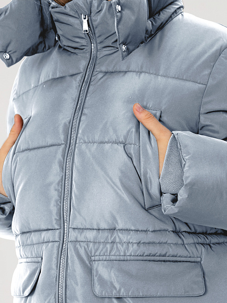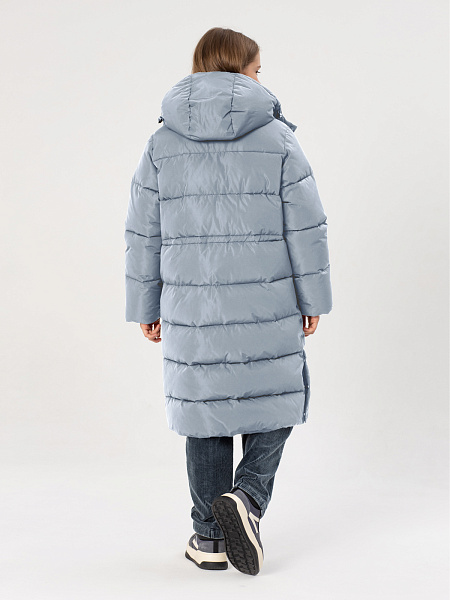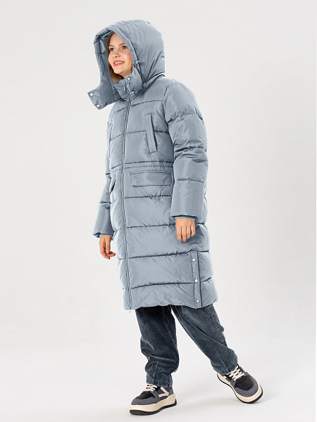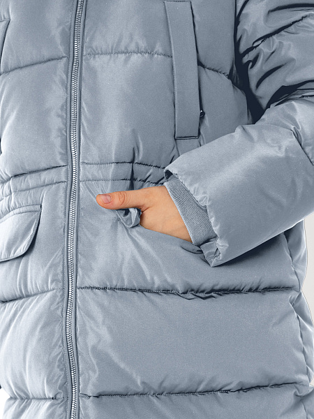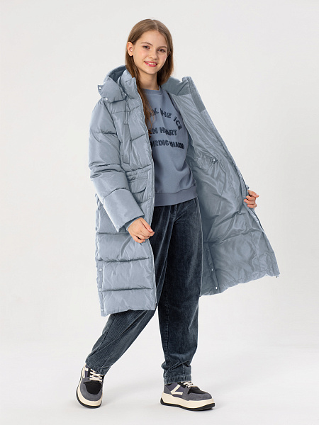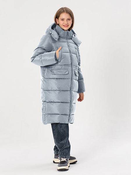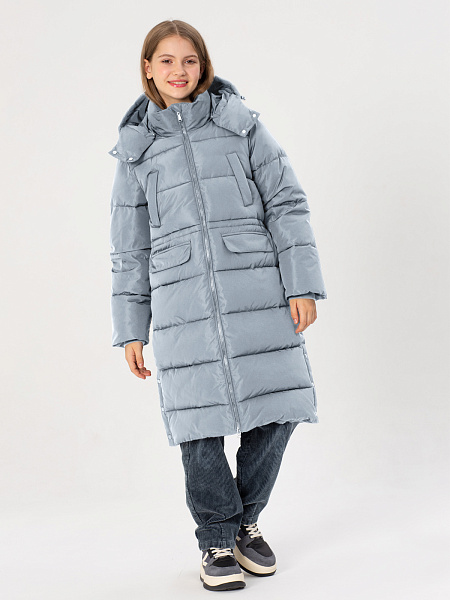 Длинный стеганный пуховик для девочки в голубом цвете — надежная защита от холода. Модель изготовлена из мембранной ткани с показателями 5000/5000, которая хорошо защищает от влаги и пропускает воздух. Утеплитель из искусственного пуха плотностью 350 г/м² обеспечивает тепло в холодную погоду. В конструкции предусмотрен съемный капюшон, удобная молния и система карманов: два нагрудных на молнии и два с клапанами. Утяжка в поясе помогает регулировать силуэт, а разрезы на кнопках по бокам дают свободу движений. Эластичные манжеты защищают от попадания холодного воздуха, что делает пуховик практичным для повседневной носки и зимних прогулок.