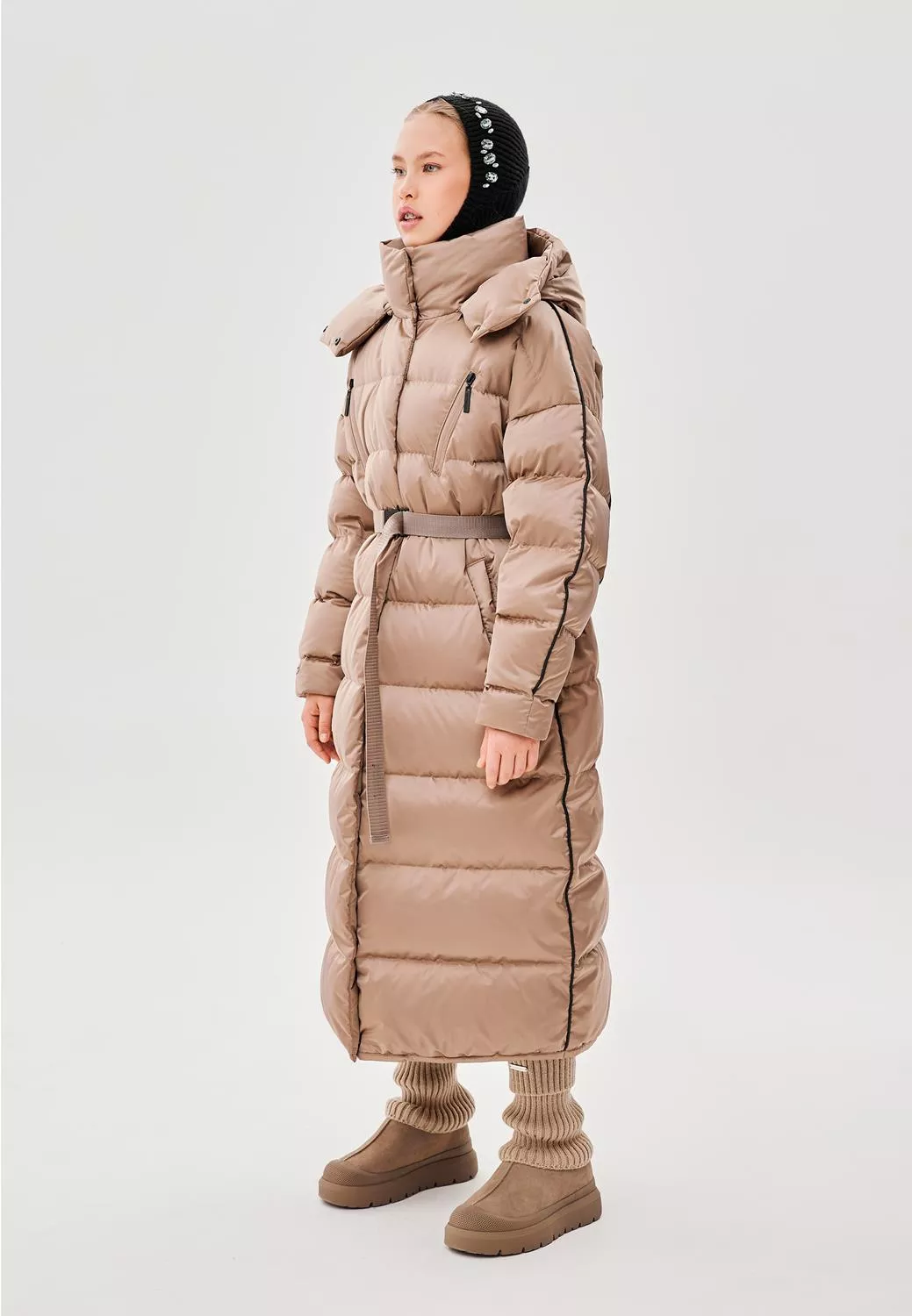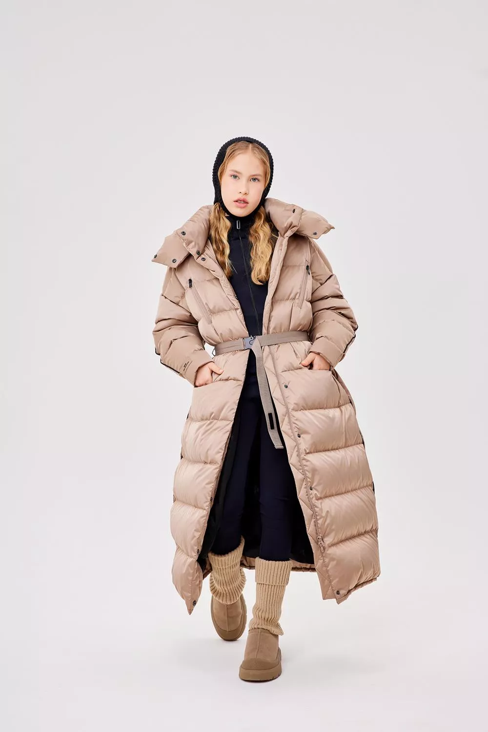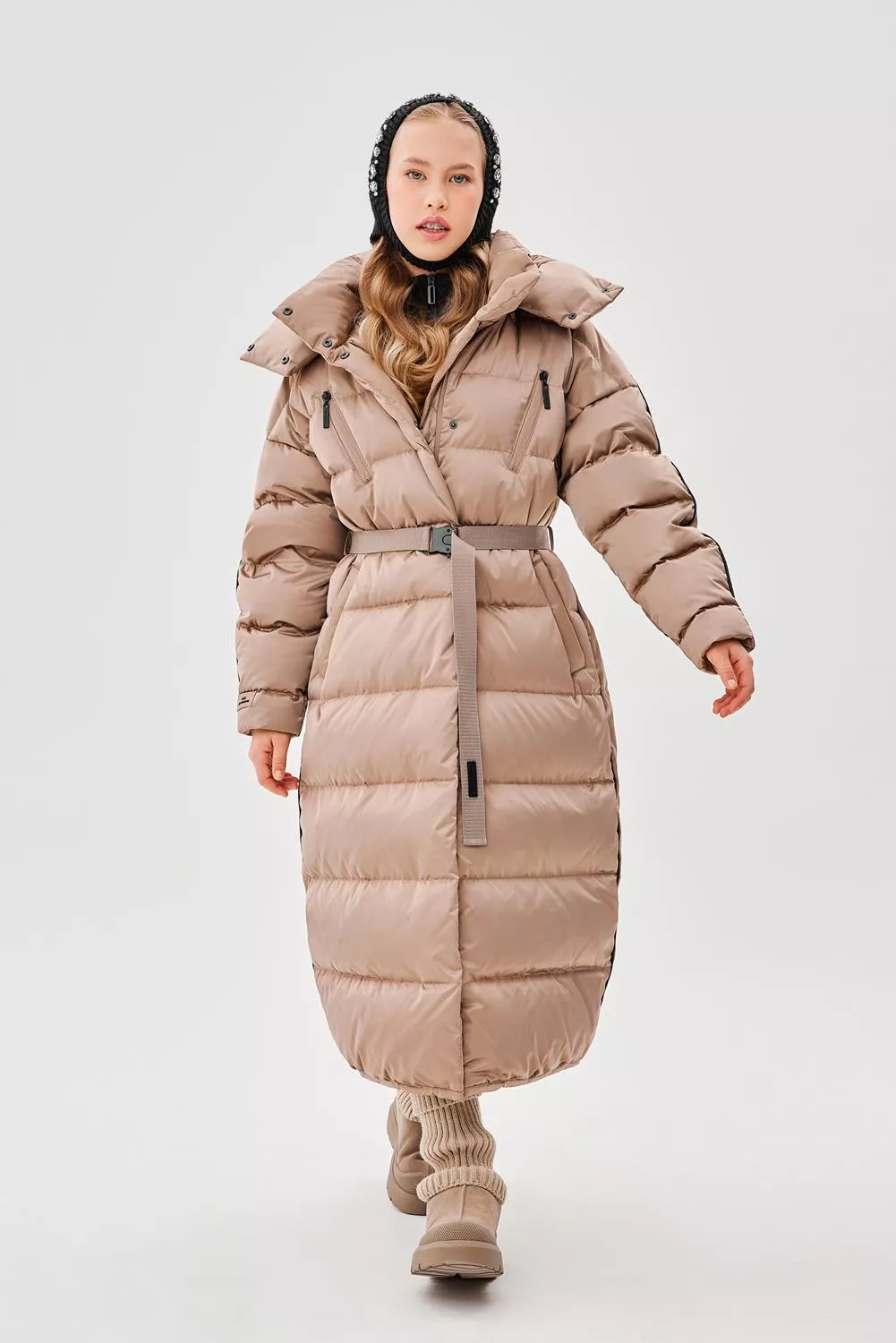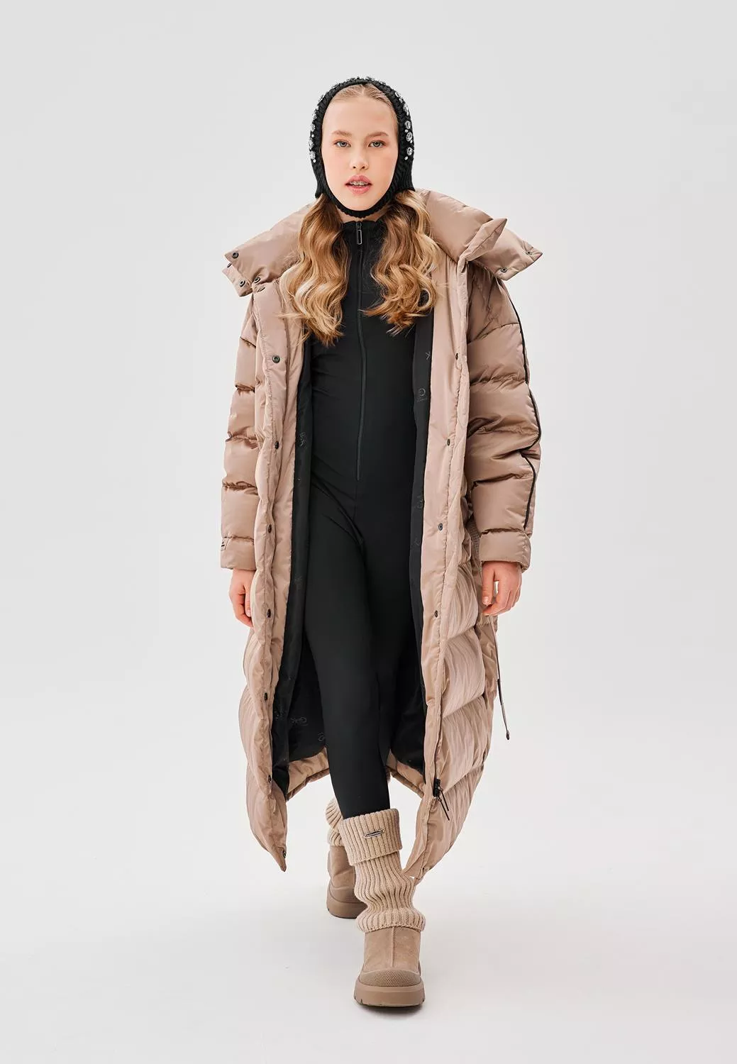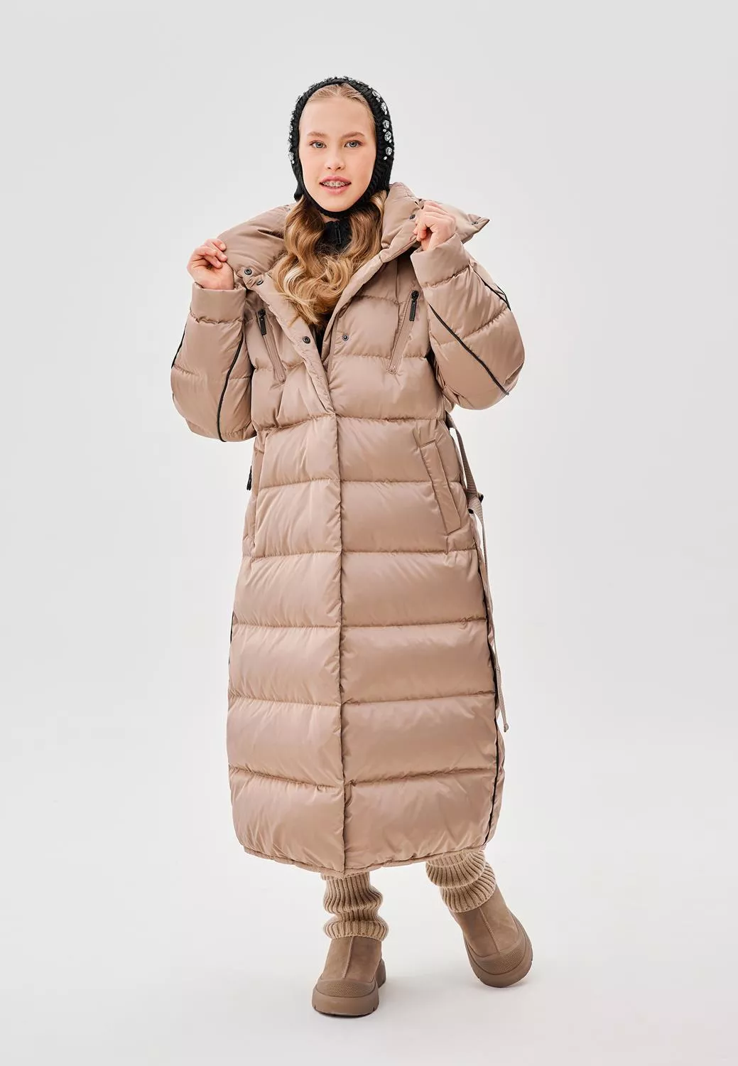 Пальто свободного прямого силуэта. Рукав втачной, со спущенной линией плеча. Воротник-стойка. Капюшон - шлем, застегивающийся на потайные кнопки. Капюшон съемный, пристегивается на молнию. Край капюшона-с кулисой, регулируемой шнуром-резинкой и стопорами. Застежка центральная на молнию, с цельнокроеной верхней ветрозащитной планкой, застегивающейся на потайные кнопки. Изделие стеганое горизонтальными переборками. На переде выполнены вертикальные прорезные карманы с листочками. Округлая 3-D форма рукава за счет центрального и локтевого швов рукава. Внутри рукав оформлен трикотажными манжетами. С помощью съемного пояса возможна трансформация силуэта.