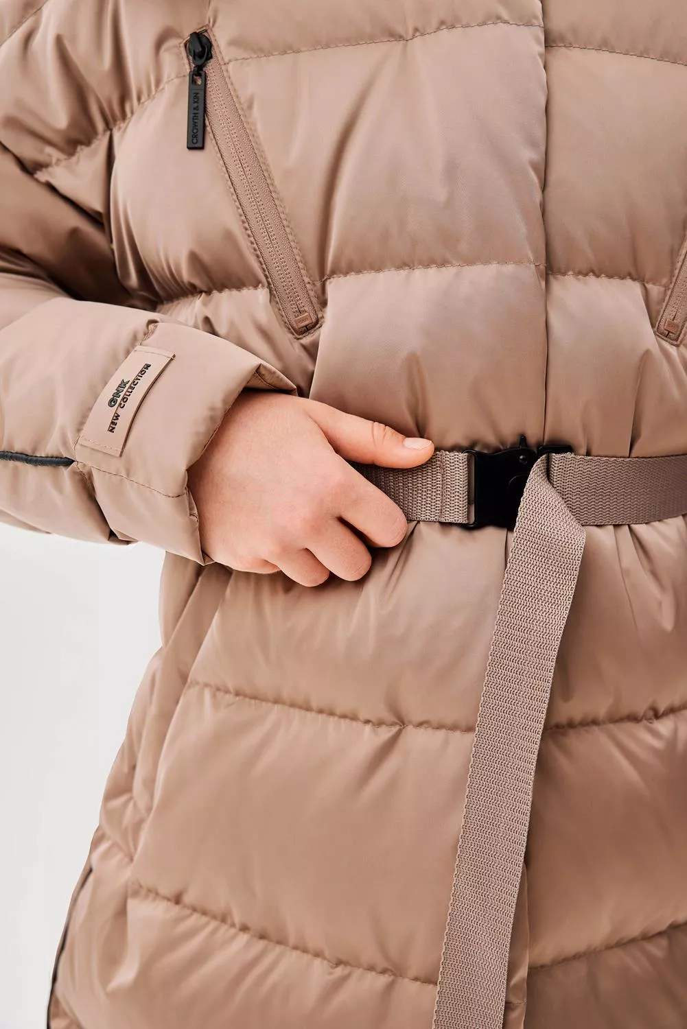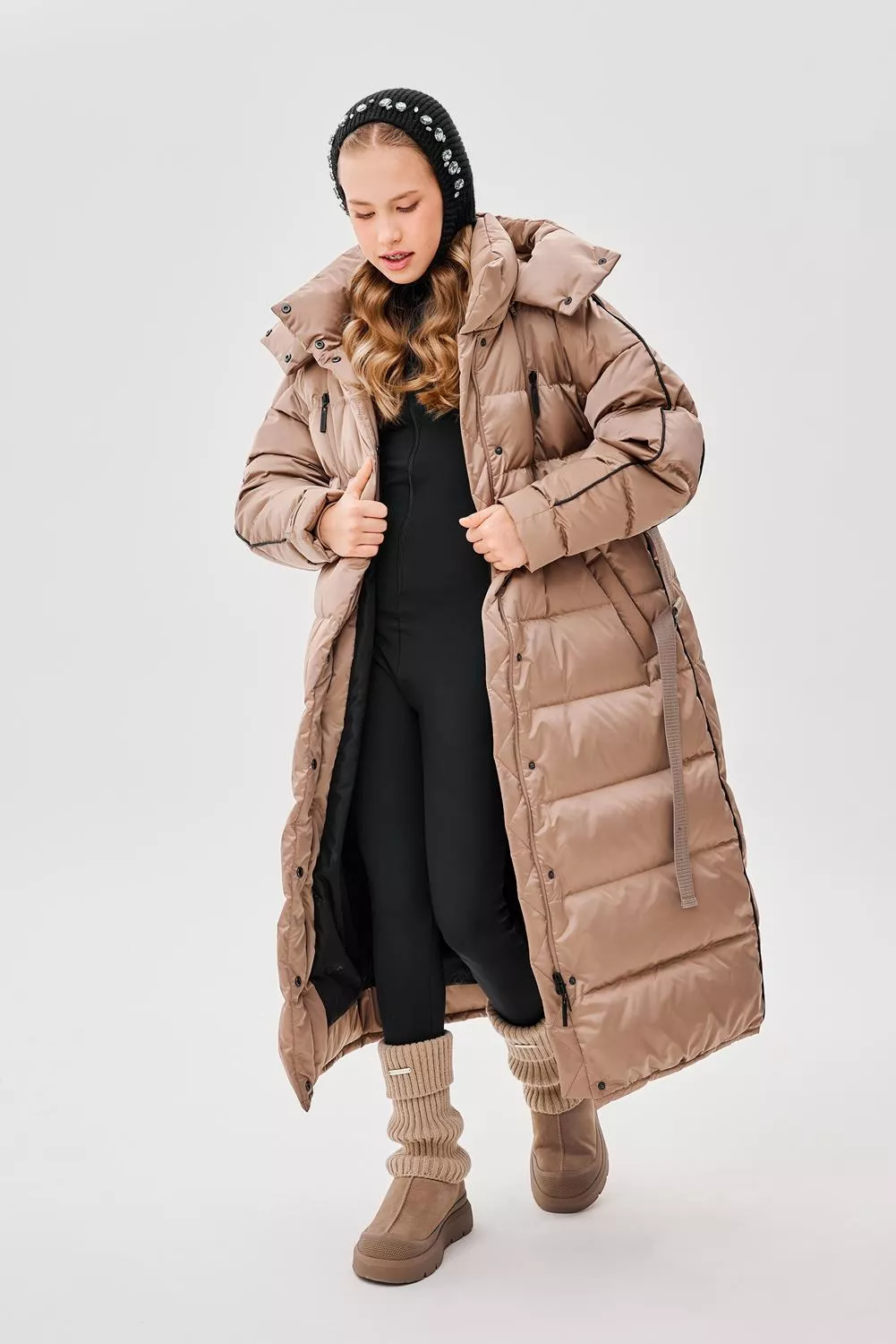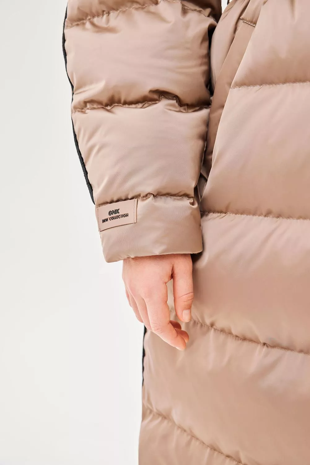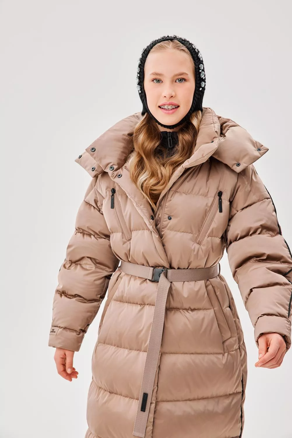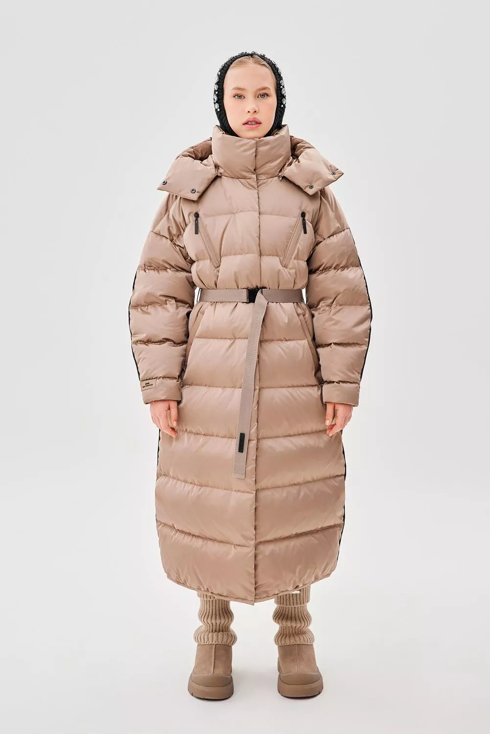 Пальто свободного прямого силуэта. Рукав втачной, со спущенной линией плеча. Воротник-стойка. Капюшон - шлем, застегивающийся на потайные кнопки. Капюшон съемный, пристегивается на молнию. Край капюшона-с кулисой, регулируемой шнуром-резинкой и стопорами. Застежка центральная на молнию, с цельнокроеной верхней ветрозащитной планкой, застегивающейся на потайные кнопки. Изделие стеганое горизонтальными переборками. На переде выполнены вертикальные прорезные карманы с листочками. Округлая 3-D форма рукава за счет центрального и локтевого швов рукава. Внутри рукав оформлен трикотажными манжетами. С помощью съемного пояса возможна трансформация силуэта.