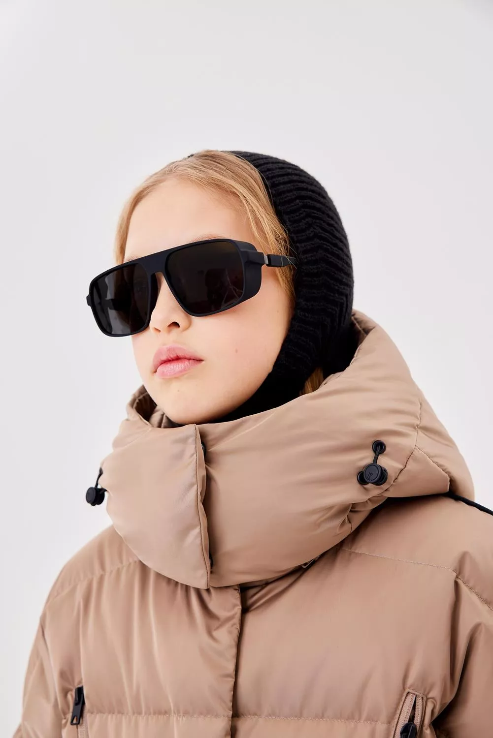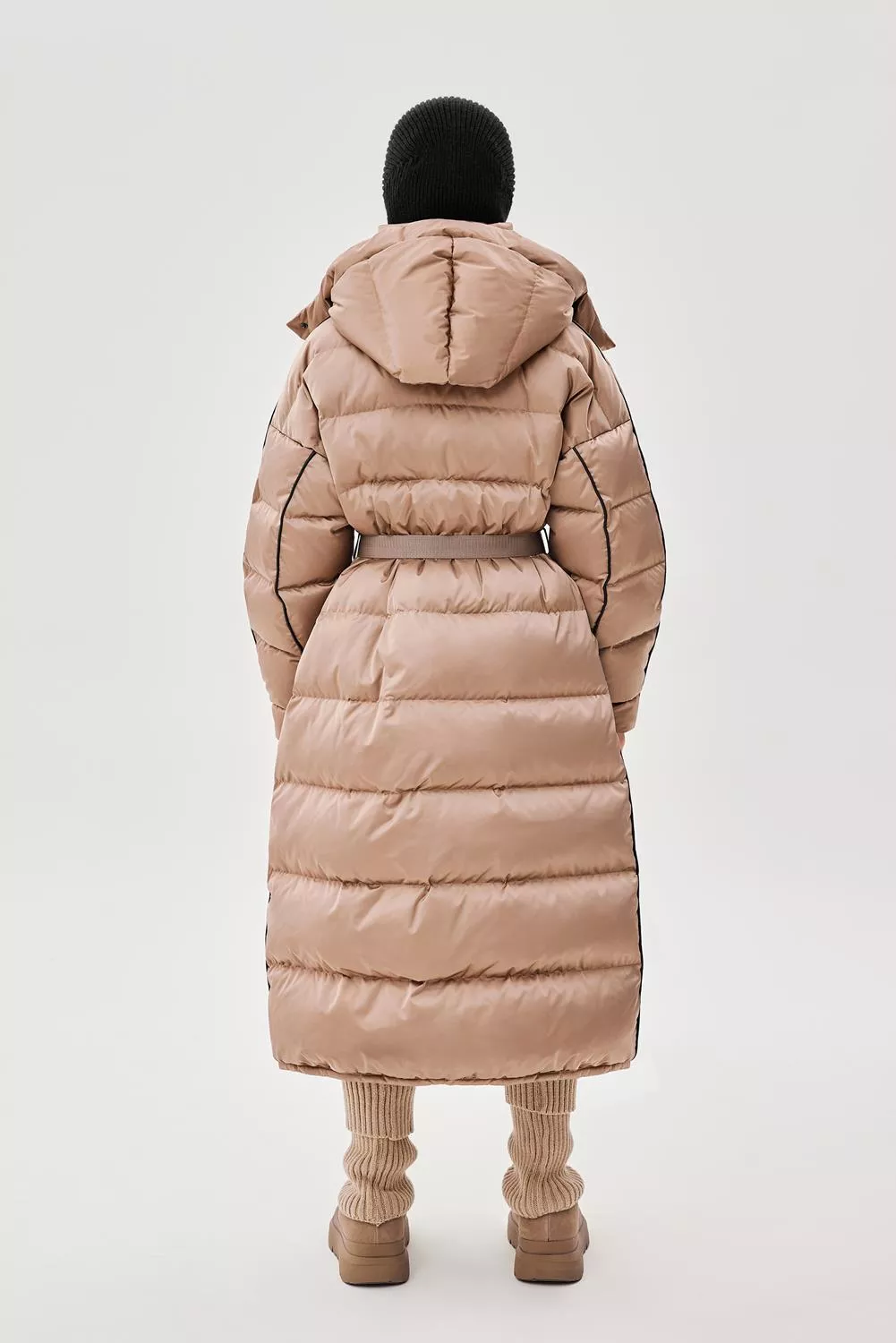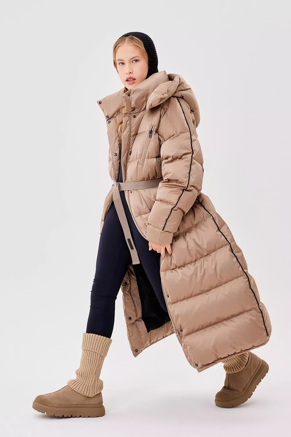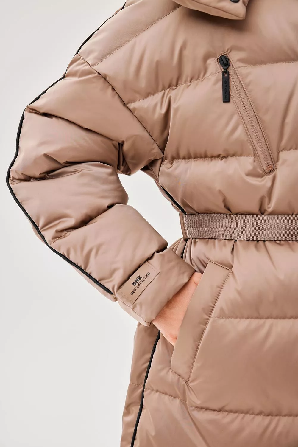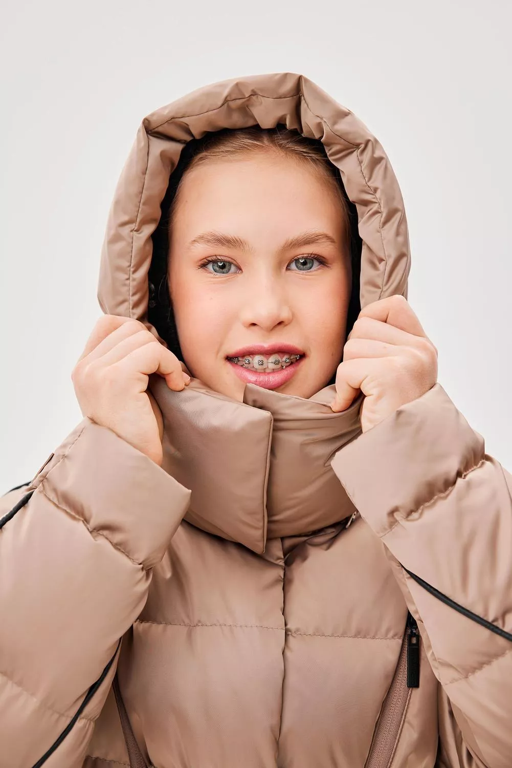 Пальто свободного прямого силуэта. Рукав втачной, со спущенной линией плеча. Воротник-стойка. Капюшон - шлем, застегивающийся на потайные кнопки. Капюшон съемный, пристегивается на молнию. Край капюшона-с кулисой, регулируемой шнуром-резинкой и стопорами. Застежка центральная на молнию, с цельнокроеной верхней ветрозащитной планкой, застегивающейся на потайные кнопки. Изделие стеганое горизонтальными переборками. На переде выполнены вертикальные прорезные карманы с листочками. Округлая 3-D форма рукава за счет центрального и локтевого швов рукава. Внутри рукав оформлен трикотажными манжетами. С помощью съемного пояса возможна трансформация силуэта.
