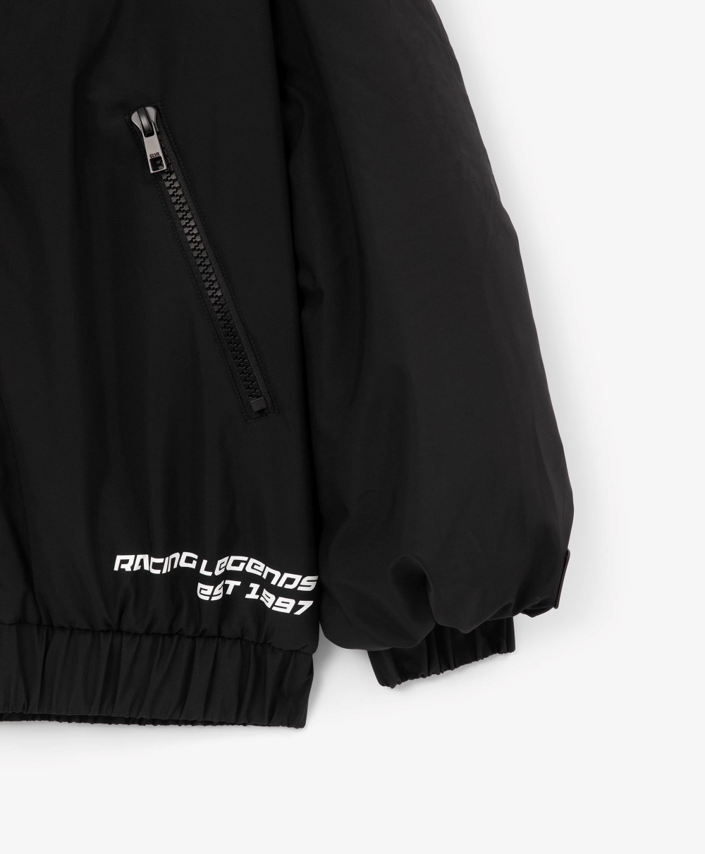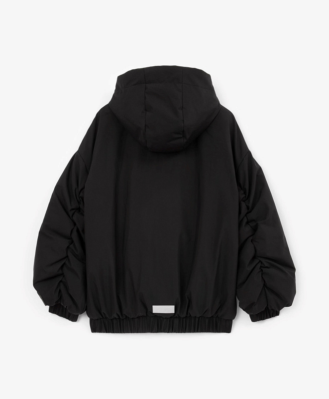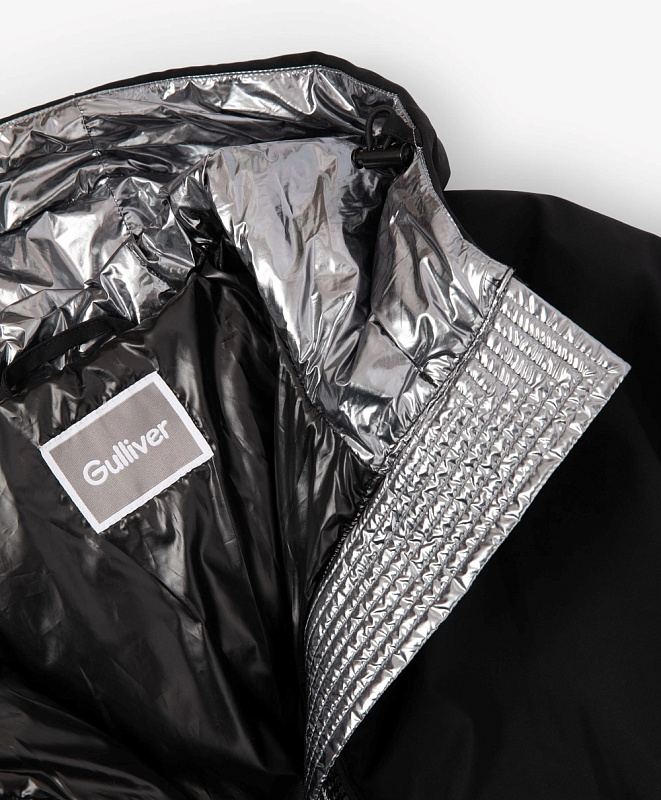 Чёрное демисезонное пальто, вдохновленное эстетикой футуризма, не оставит  девочку равнодушной! Мягкое, объемное, уютное, оно формирует модные пропорции в образе и создает необыкновенный комфорт, позволяя делать образ сложным и  многослойным. Пальто выполнено из матовой влагостойкой плащовки на искусственном пуху. Оно имеет ряд функциональных деталей: два кармана на молниях, отстёгивающийся капюшон с подкладкой и отделкой из серебристой плащовки, манжеты на резинке. В оформлении пальто использован лаконичный шрифтовой принт. Пальто застёгивается на тракторную молнию. На спинке изделия расположен светоотражающий элемент, способствующий безопасности девочки в тёмное время суток.