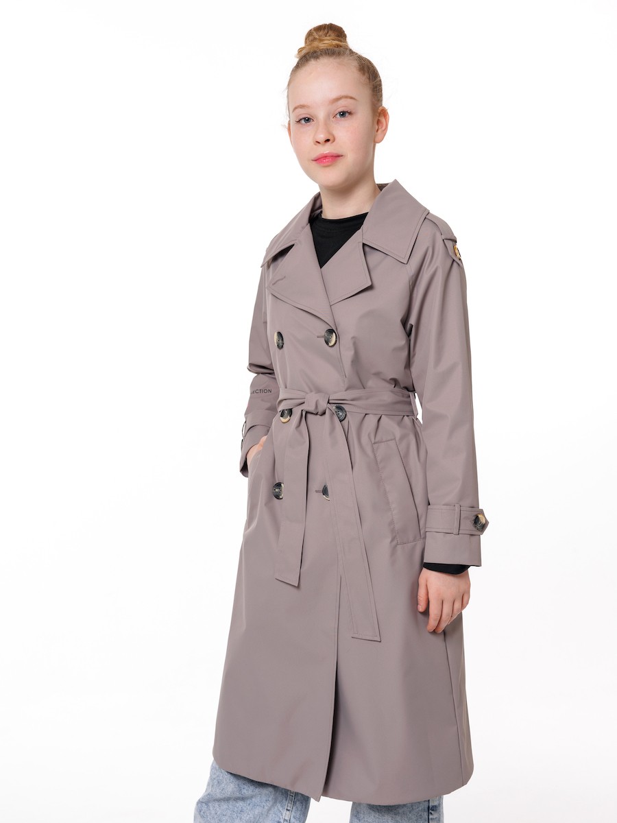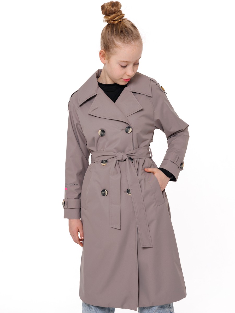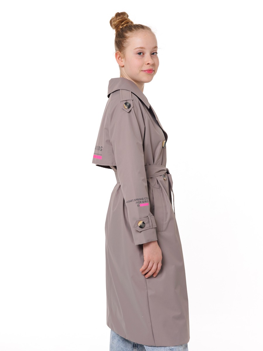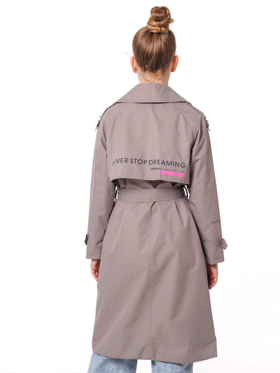 Классический двубортный плащ - прекрасное дополнение к школьной форме. Плащ стильный, эргономичный. Спинка дополнена отлетной кокеткой. Рукав-реглан. Застежка – пуговицы. Линия талии подчеркнута поясом. Два боковых кармана с широкими листочками. Большой отложной воротник. Дополняют модель погоны и отделочные паты в нижней части рукавов. На правом рукаве и на отлетной кокетке эффектный текстовый накат и термопринт неонового цвета. В боковом шве - светоотражающий флажок. Рекомендованная температура использования от +15  до +20 гр.