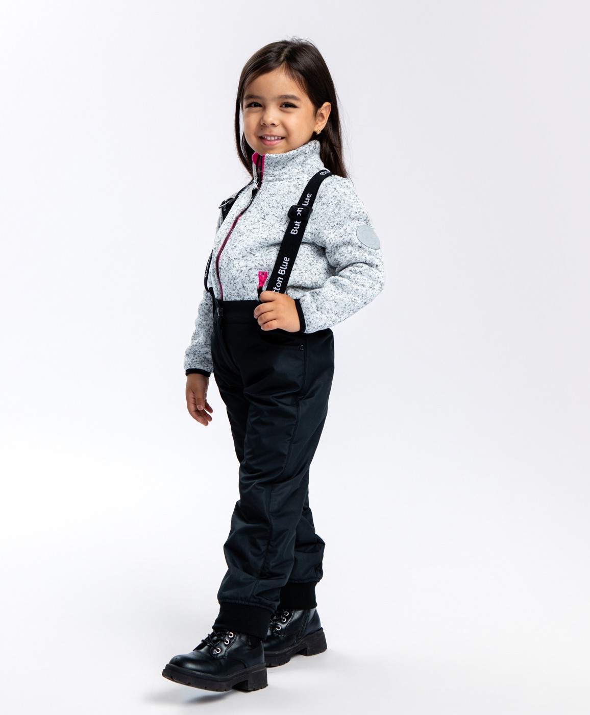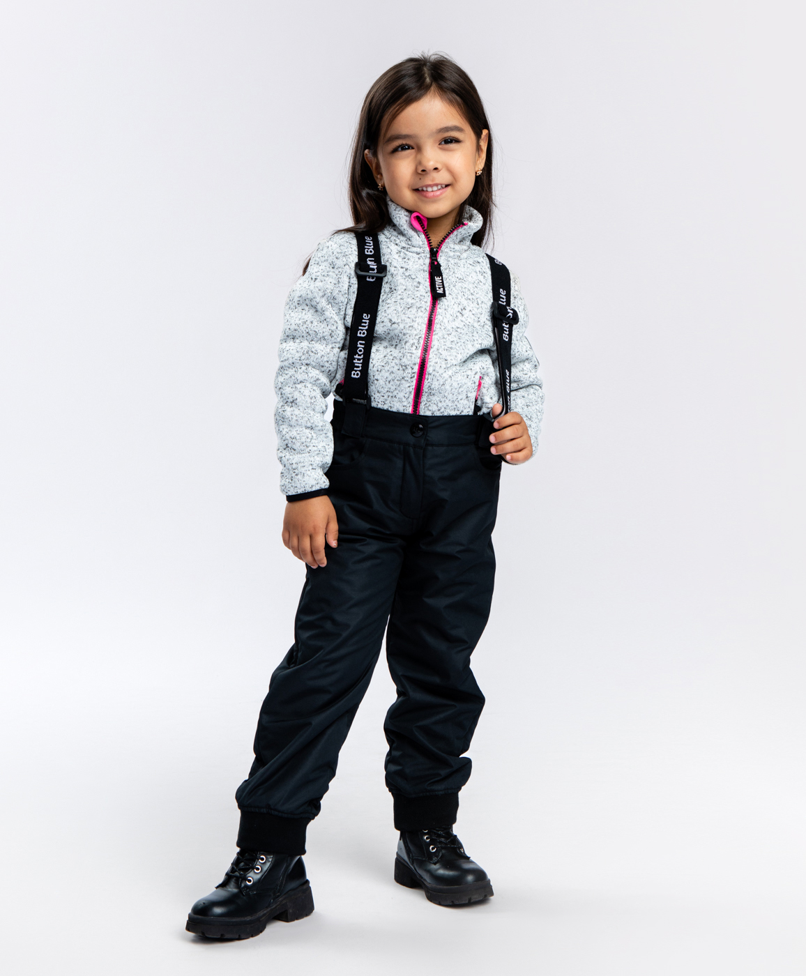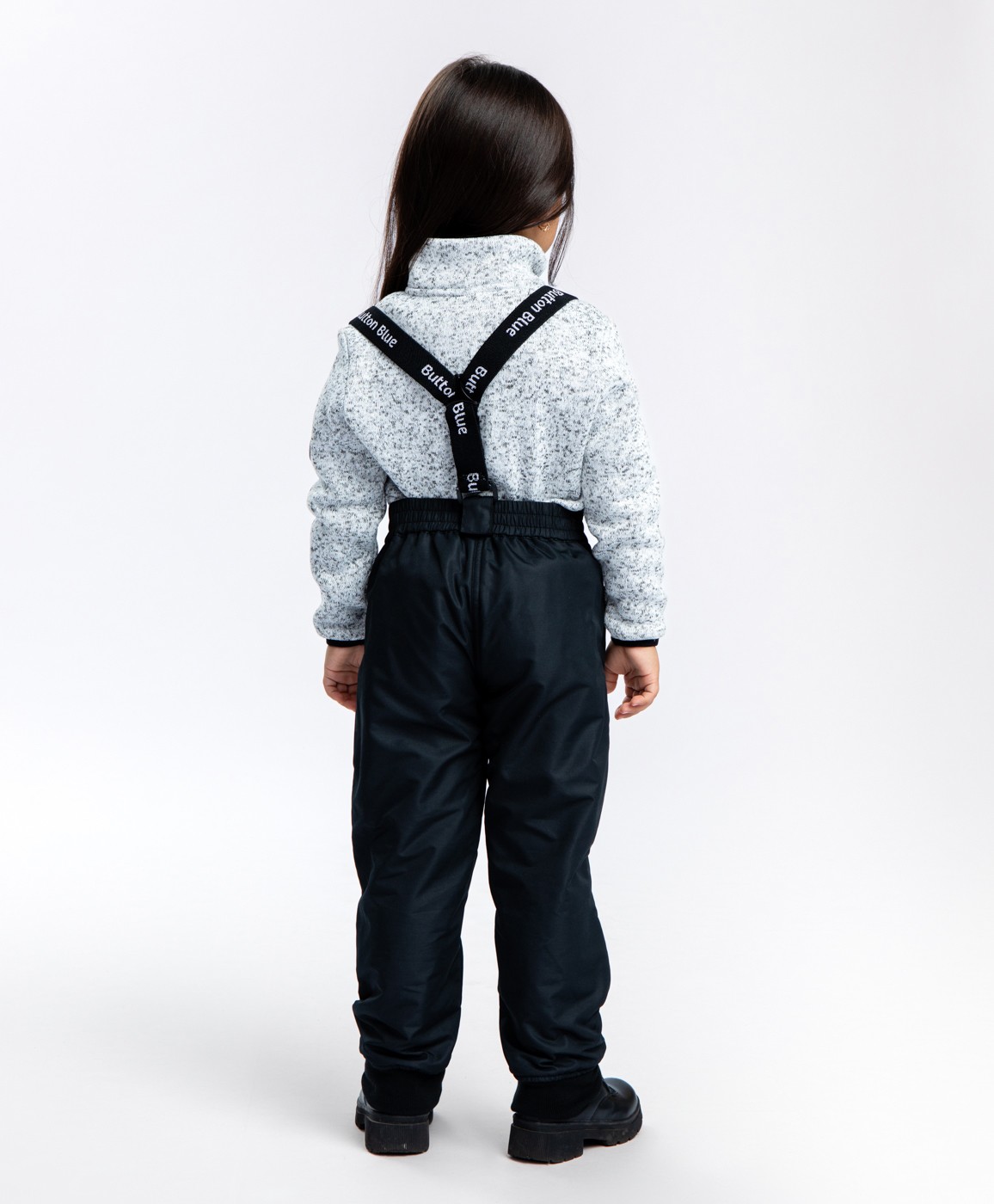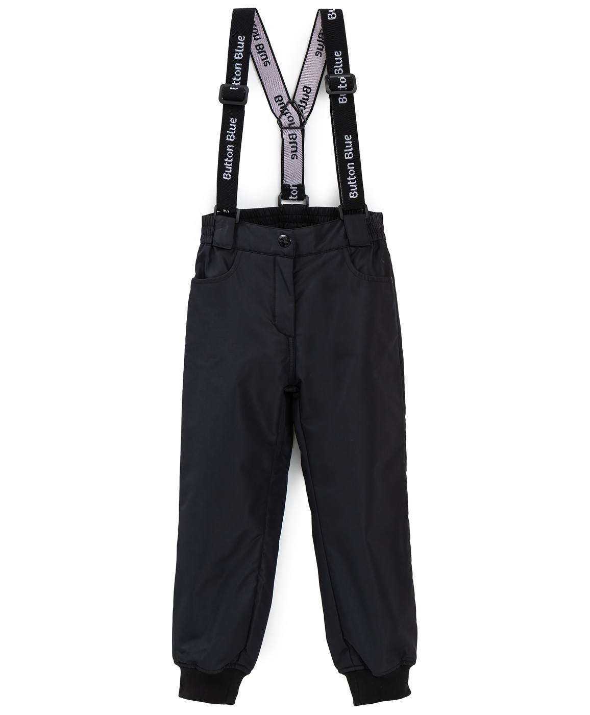 Демисезонные брюки с флисовой подкладкой без утеплителя для девочки. Регулируемые подтяжки помогут подобрать оптимальную посадку. Подтяжки можно полностью снять - они крепятся к брюкам при помощи удобных липучек. Водоотталкивающее покрытие WR способствует тому, чтобы грязь и влага скатывались с поверхности изделия. Прямой крой брюк обеспечивает свободу в любых движениях. Рибовые манжеты сохраняют тепло и легко заправляются в любую обувь. Детские черные брюки Баттон Блю застегиваются на молнию и удобную пуговицу-крючок. Подкладка всей модели и прорезных карманов выполнена из мягкого и согревающего флиса. Брендированные подтяжки являются стильным акцентом в дизайне модели.