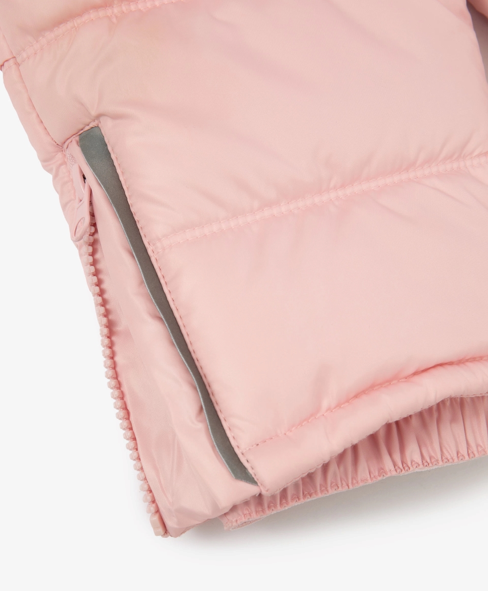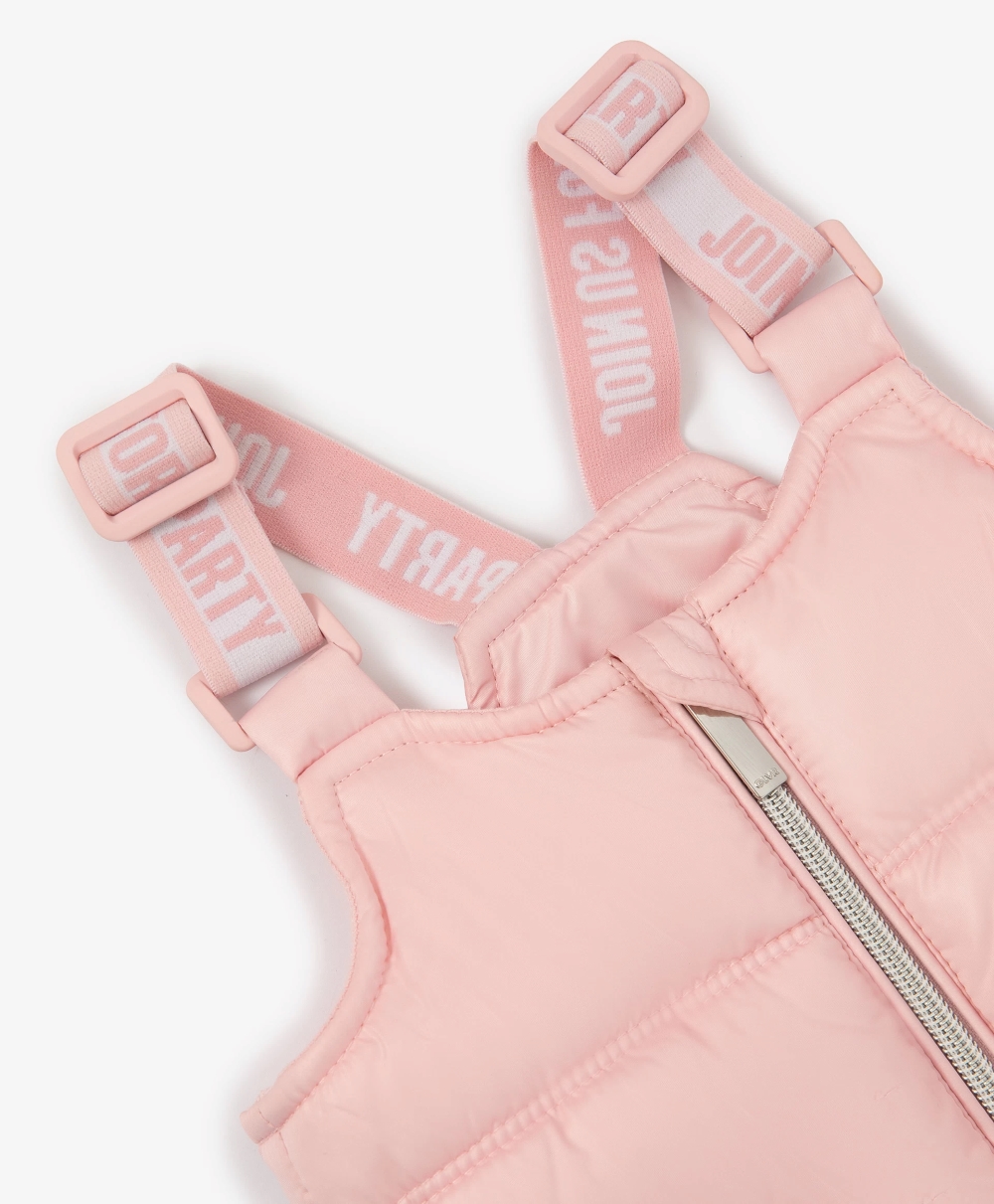 Утепленный плащевой полукомбинезон на хлопковой трикотажной подкладке - неотъемлемая составляющая зимнего образа девочки. Выполненный из плотной влагостойкой плащовки с легким блеском, стеганый полукомбинезон на искусственном пуху сделает прогулку продолжительной и комфортной. Снегозащитные манжеты исключают попадание снега внутрь. Молнии в боковых швах позволяют носить обувь разной высоты и объема. Эластичные лямки позволяют регулировать посадку изделия в зависимости от роста ребенка. Комбинезон застегивается на серебристую пластиковую молнию. В оформлении модели использованы светоотражающие элементы, повышающие безопасность девочки в тёмное время суток.