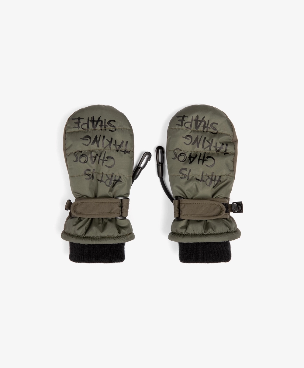 Утеплённые варежки из влагостойкой плащовки на подкладке из флиса станут неотъемлемым атрибутом активной прогулки в морозный день. Специальный протектор на ладонной части усиливает износостойкость изделия. Паты на липучках регулируют объем изделий в районе запястья. Трикотажные манжеты обеспечивают плотное прилегание варежек, что помогает избегать попадания снега внутрь. Эластичная тесьма с карабинами позволяет прикреплять варежки к куртке или комбинезону, предотвращая падение или утерю аксессуара. В оформлении модели использован лаконичный шрифтовой принт.