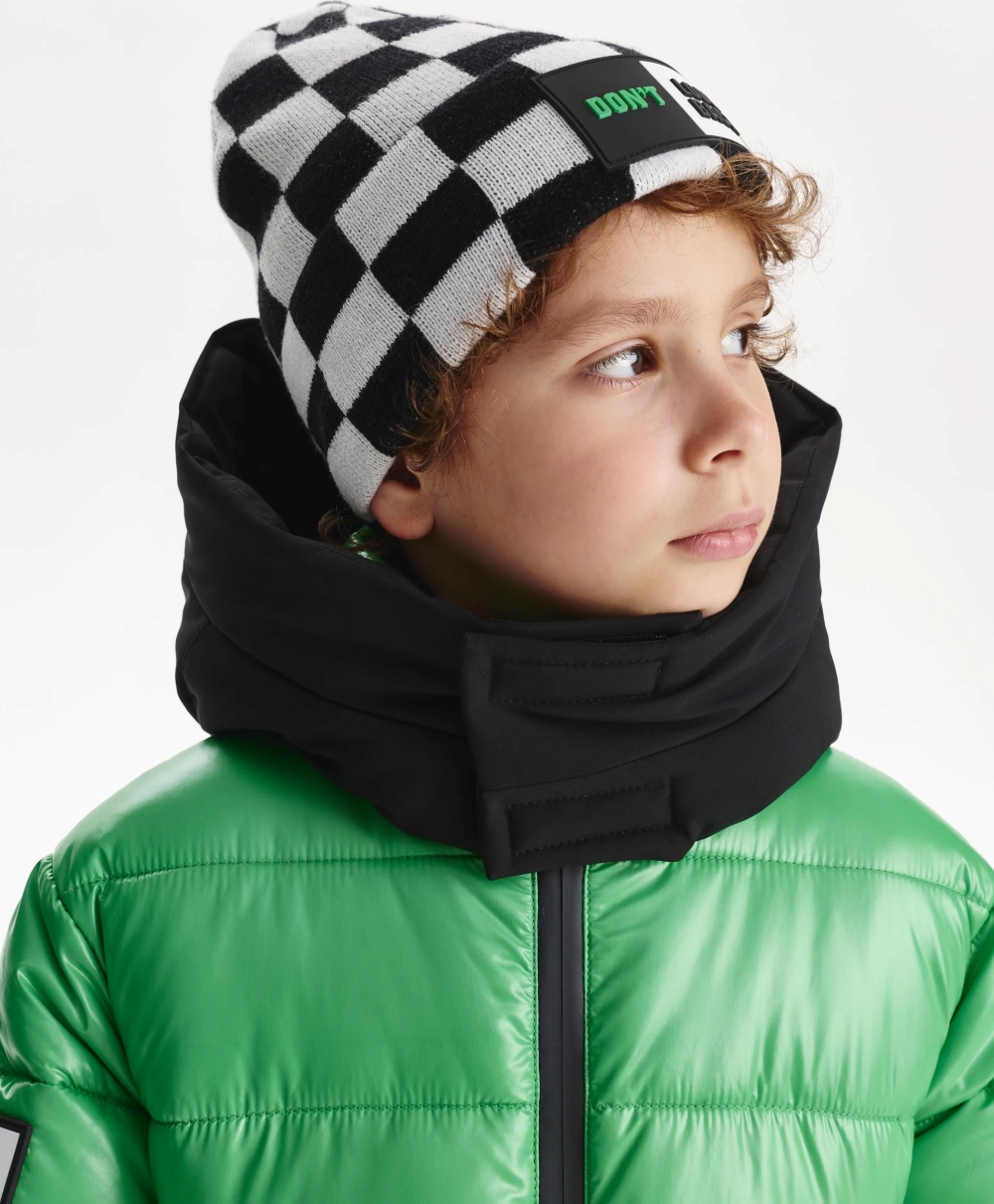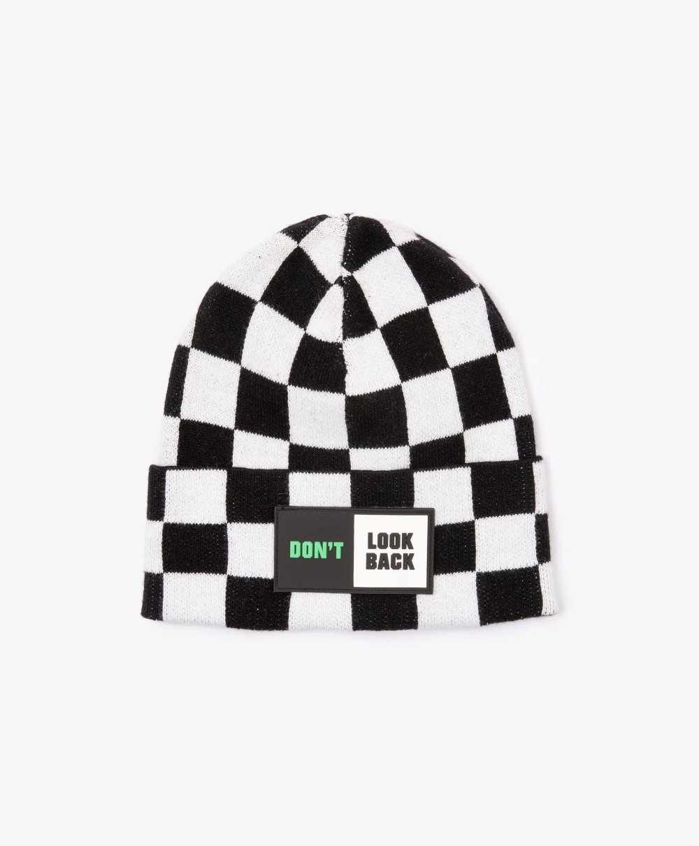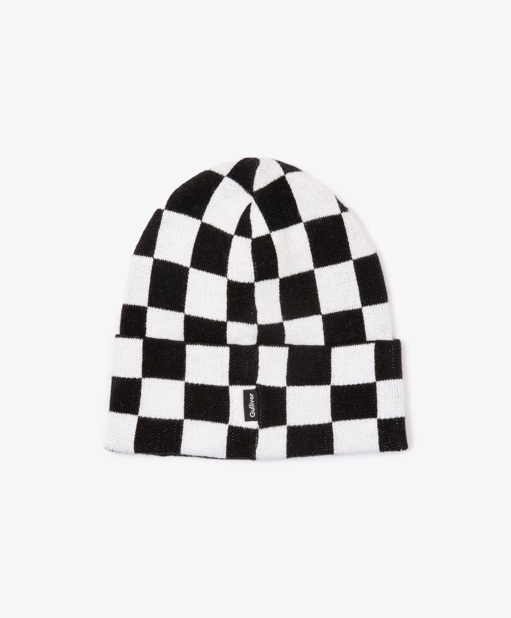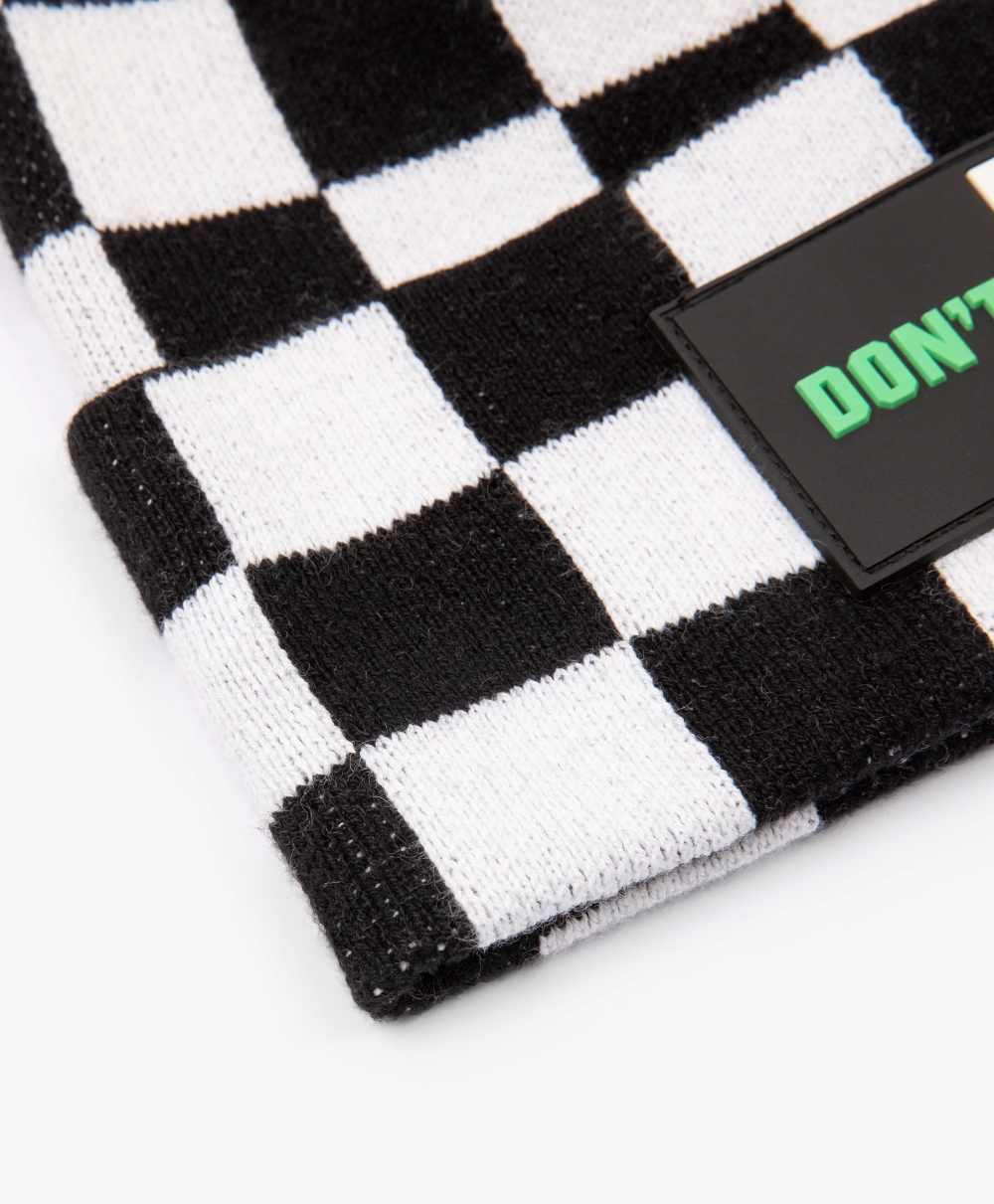 Вязаная шапка в стильную клетку станет ярким акцентом осеннего образа мальчика. Выполненная из мягкой смесовой пряжи с содержанием натуральной шерсти, шапка очень приятна при тактильном контакте. В оформлении модели использована минималистичная нашивка с шрифтовым принтом.