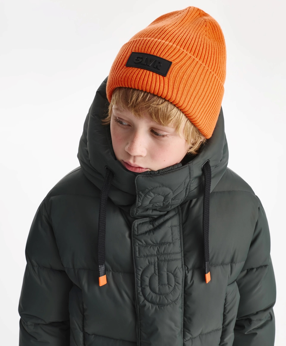 Оранжевая вязаная шапка с высоким отворотом отлично впишется в осенний образ мальчика, став его ярким акцентом. Выполненная из мягкой смесовой пряжи с небольшим содержанием шерсти, оптимальной для межсезонья, шапка очень приятна при тактильном контакте. В оформлении модели использована минималистичная нашивка с объемным шрифтовым декором.