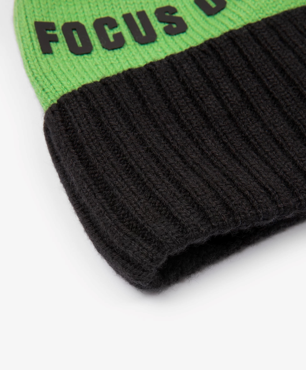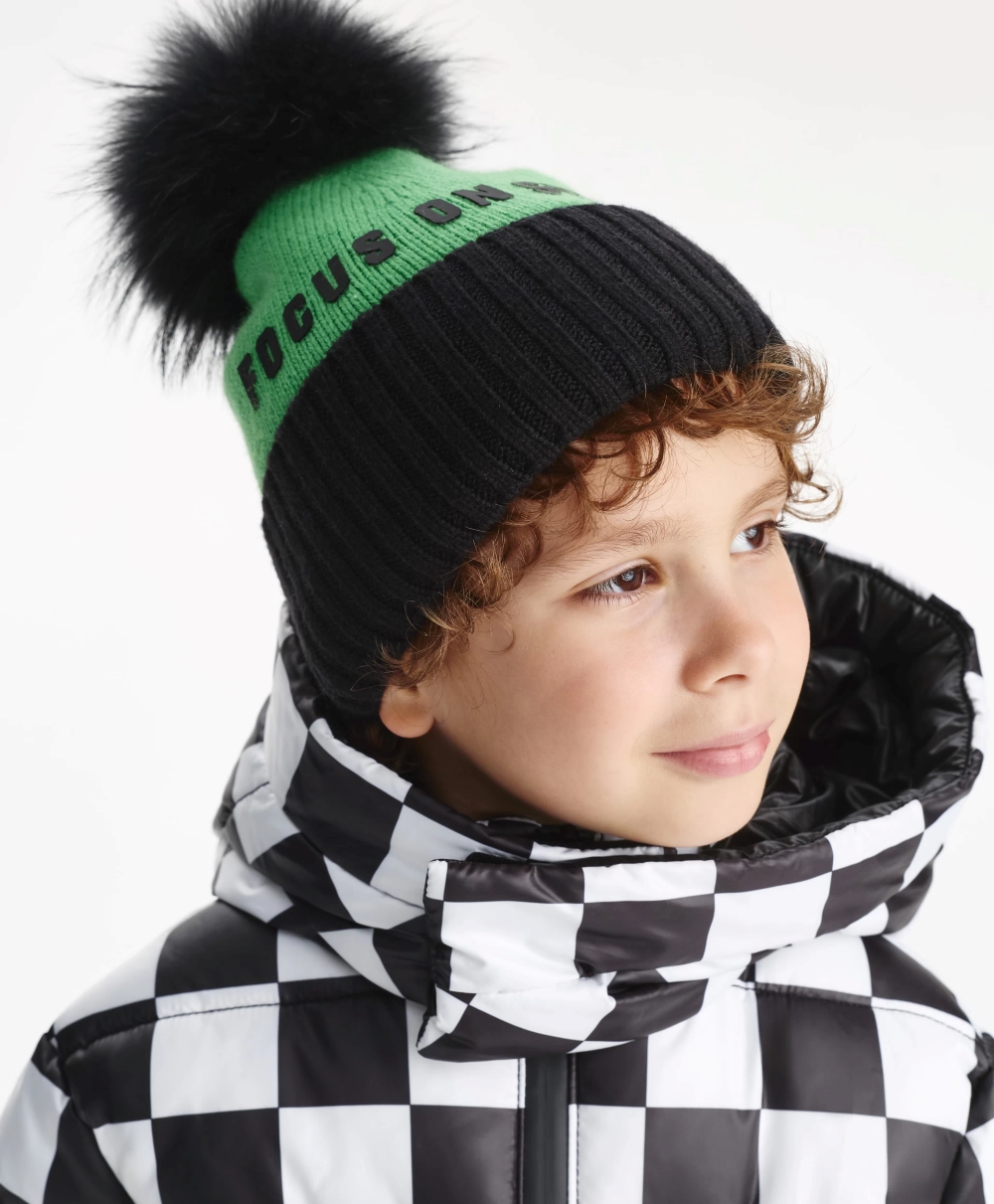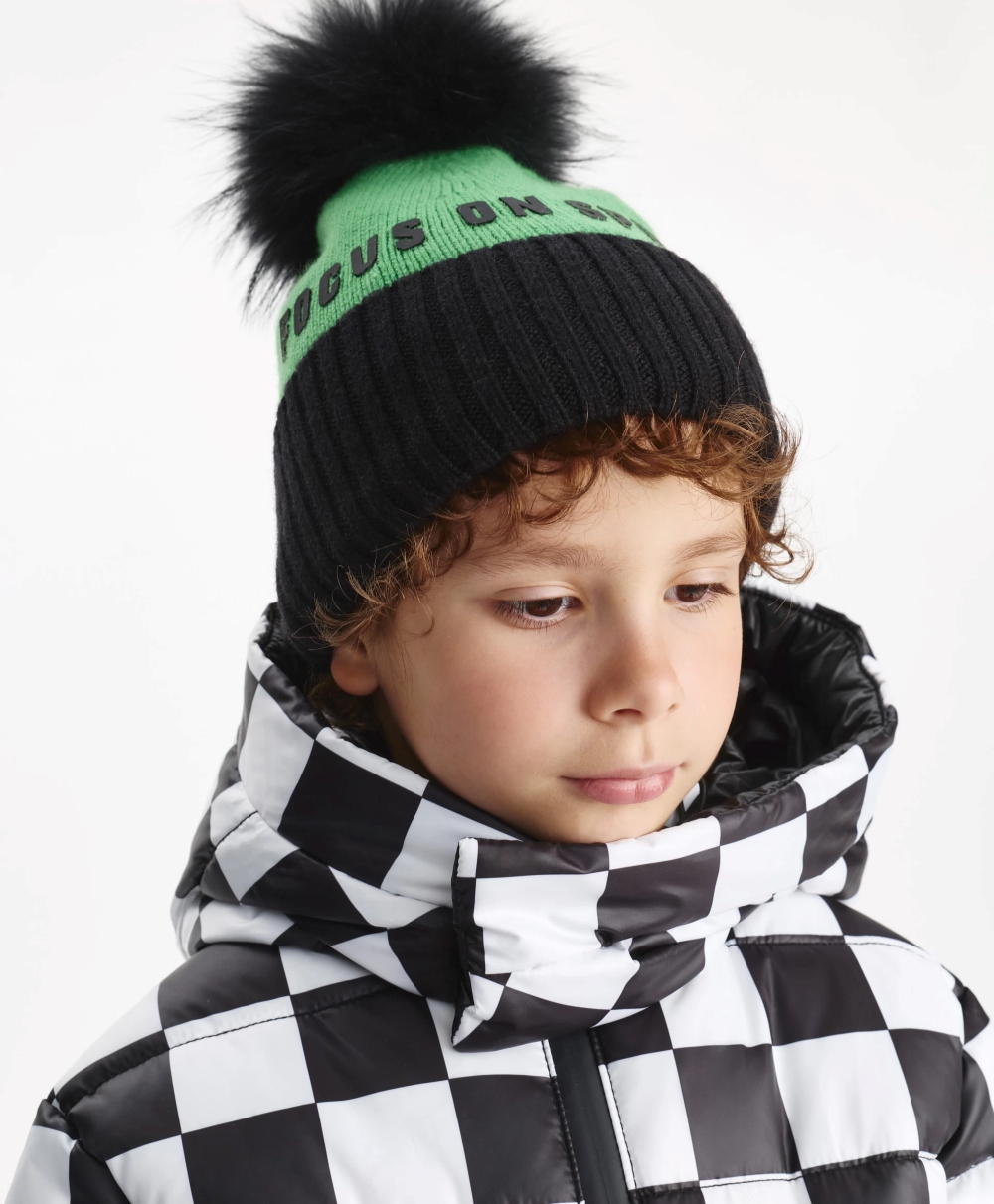 Вязаная шапка с помпоном создана для комфортных зимних прогулок мальчика. Выполненная из мягкой теплой полушерстяной пряжи на подкладке из флиса, шапка очень приятна при тактильном контакте. Дизайн модели построен на колорблокинге и стильных шрифтовых элементах, придающих любым образам с шапкой остроту и динамику спортивного стиля.