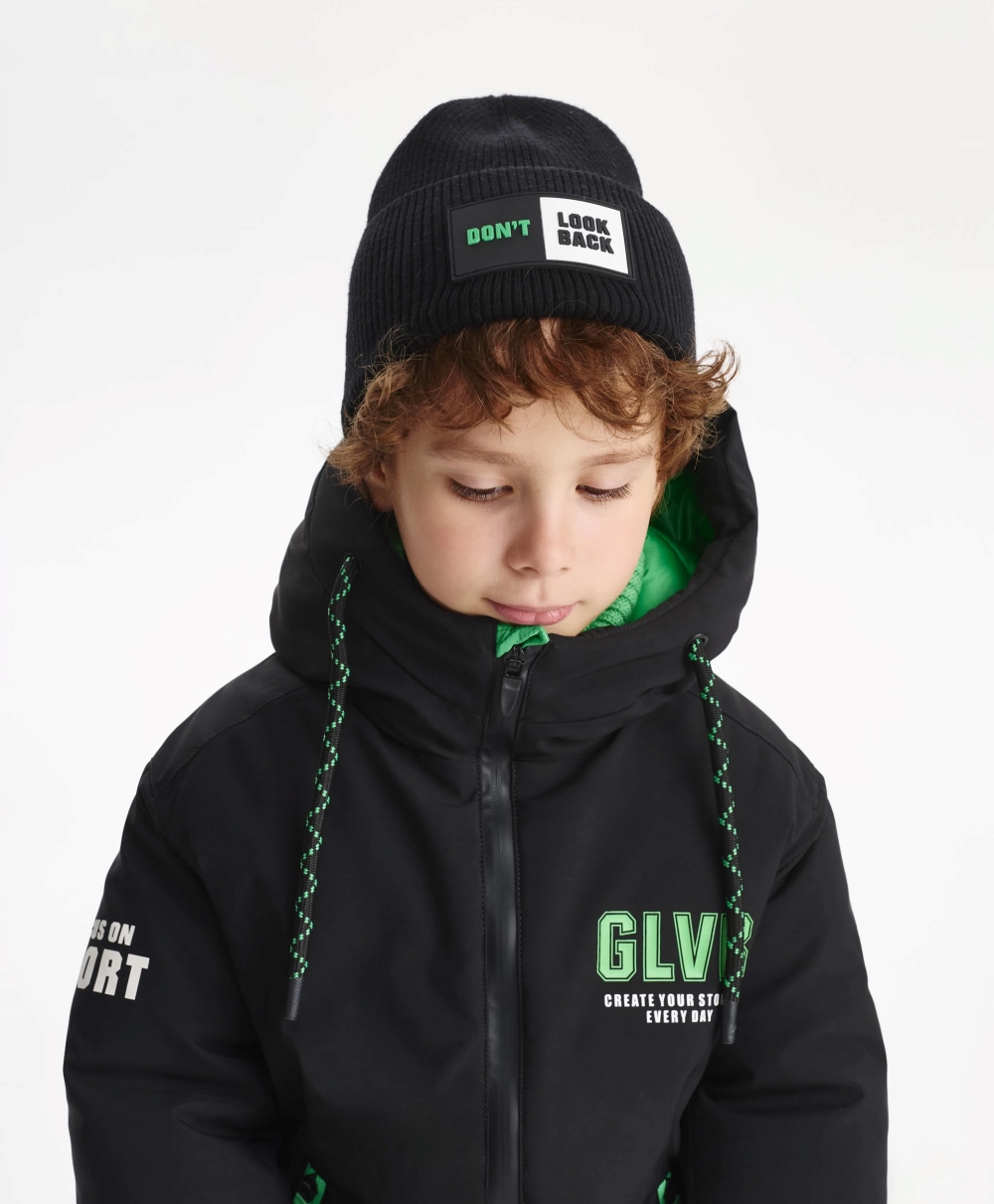 Черная вязаная шапка - стильный и практичный аксессуар, необходимый для комфортной прогулки. Выполненная из мягкой смесовой пряжи с добавлением натуральной шерсти, шапка очень приятна при тактильном контакте. В оформлении модели использована минималистичная контрастная нашивка с шрифтовым принтом.