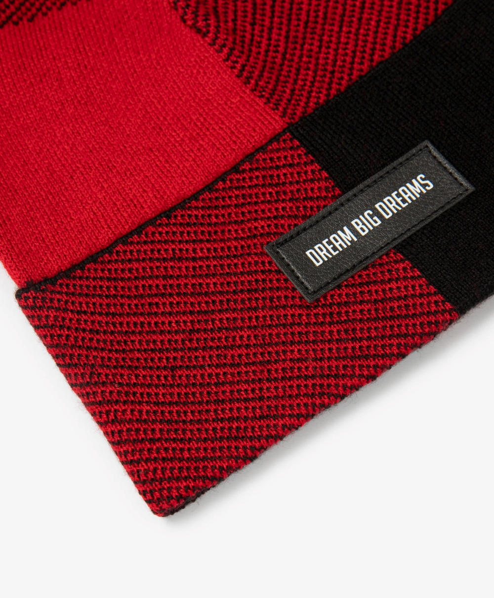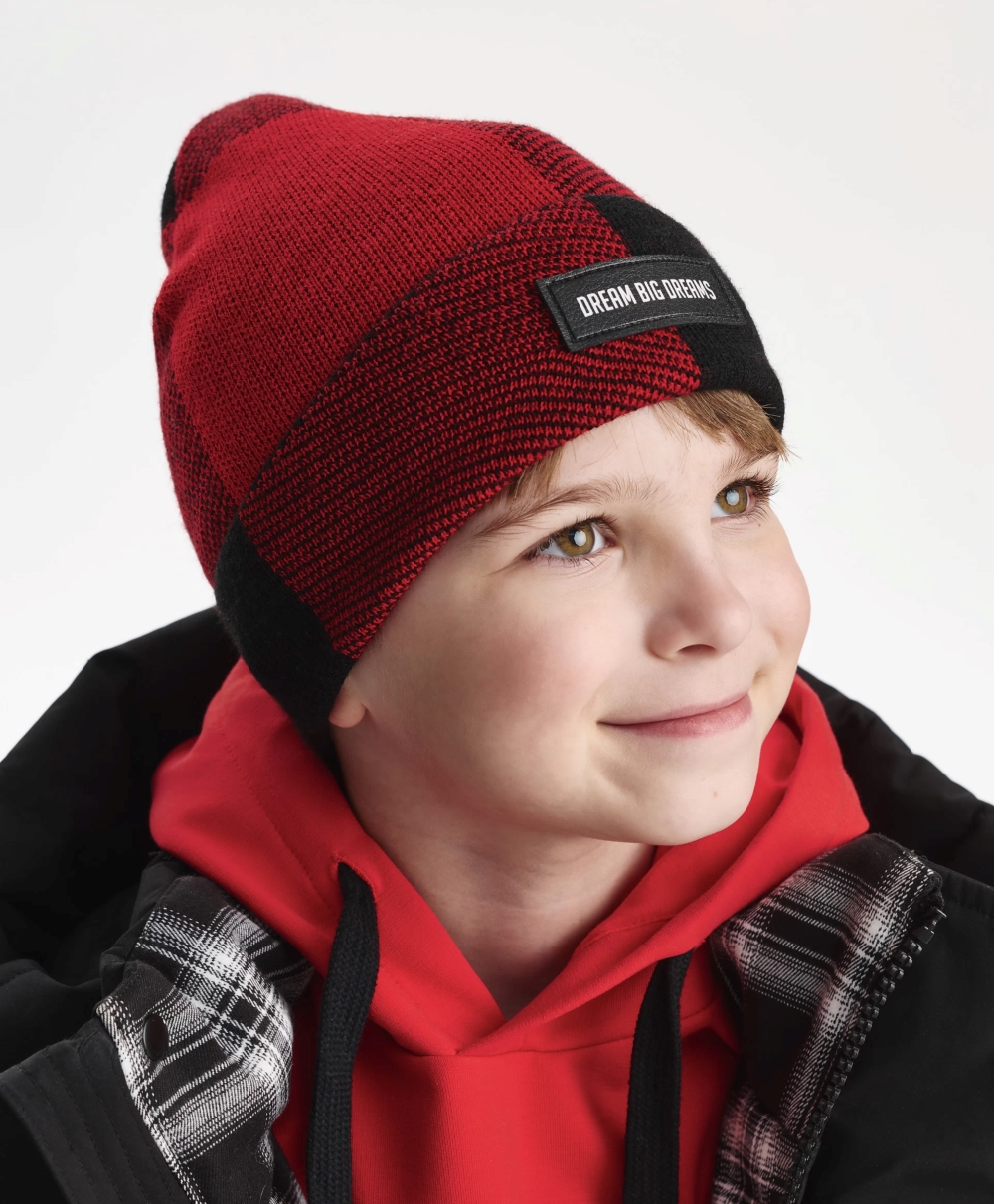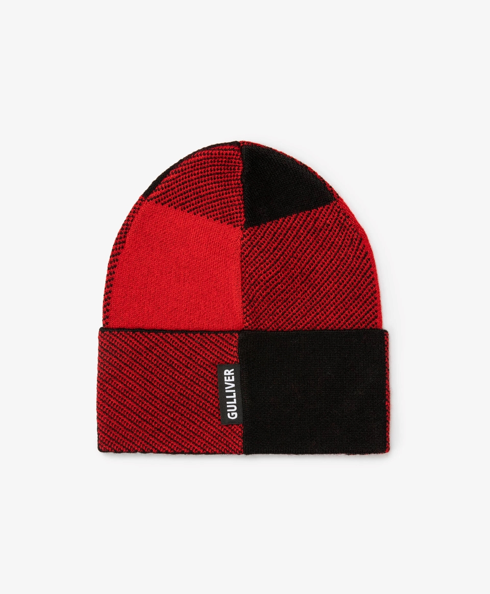 Вязаная шапка с отворотом в крупную контрастную клетку "буффало" — стильное небанальное завершение осенне-зимних образов мальчика. Выполненная из мягкой и теплой полушерстяной пряжи, шапка очень приятна при тактильном контакте. В оформлении модели использована минималистичная кожаная нашивка.