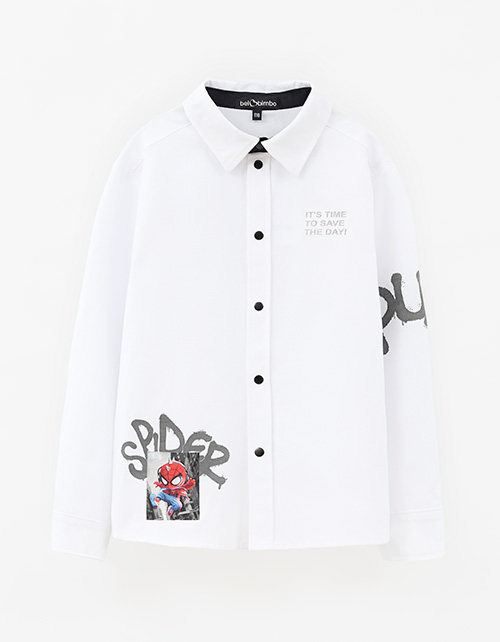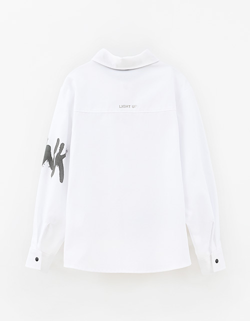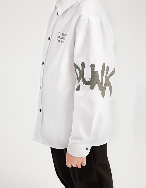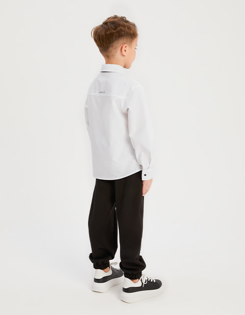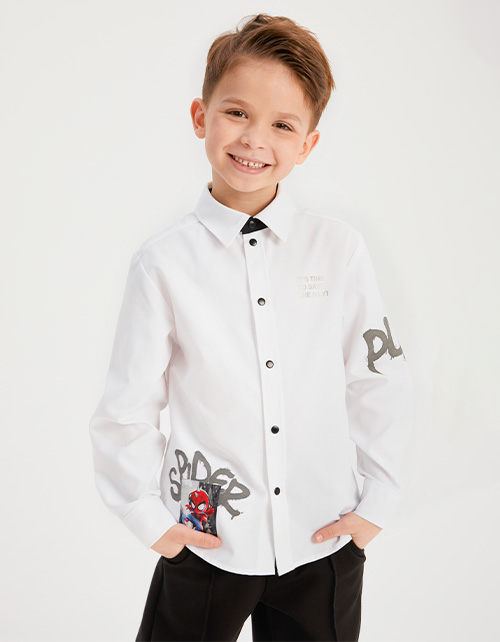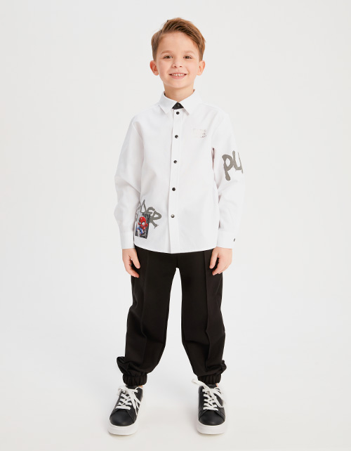 Белая рубашка для мальчика. Модель комфортного прямого силуэта. Комфортная застёжка на кнопки. Рубашка декорирована авторским цифровым принтом, инновационной DTF и трансферной плёнкой.