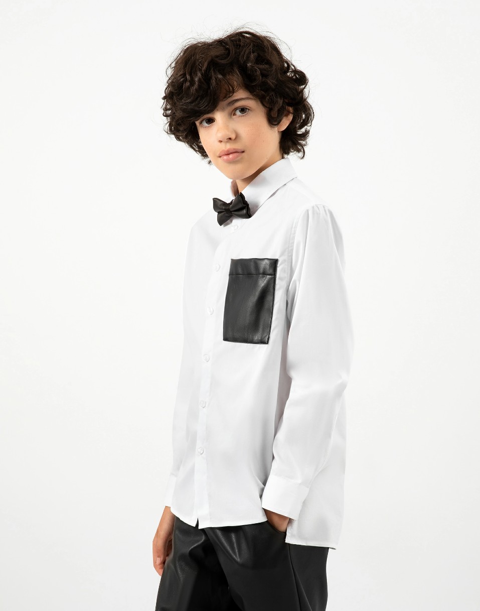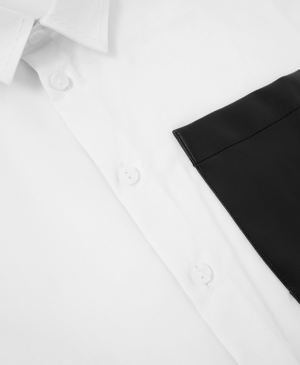 Белая рубашка модной свободной формы с удлинённой линией спинки - прекрасный способ создать стильный элегантный образ, построенный на непринужденности и комфорте. Изюминка модели - контрастный карман из искусственной кожи. Он делает рубашку острой, яркой, современной, отличающейся от строгих повседневных школьных вариантов. Рубашку стоит носить навыпуск.