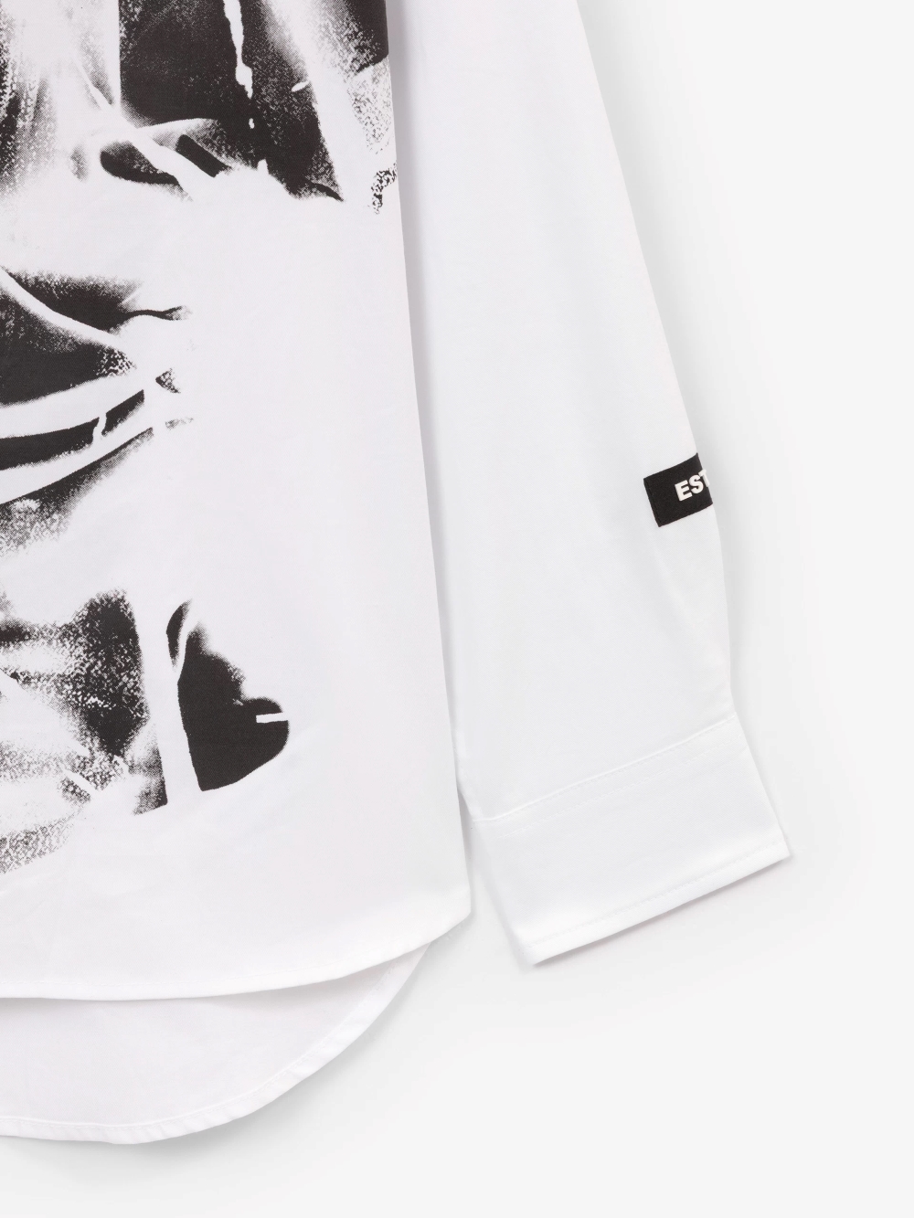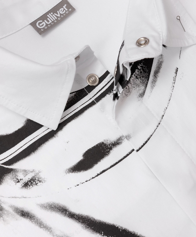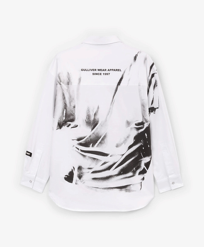 Белая рубашка из поплина с контрастным абстрактным рисунком — яркая дизайнерская вещь, способствующая формированию острых, стильных, небанальных аутфитов подростка. Прямая свободная форма, заниженная линия спинки делают рубашку неформальной, комфортной, прекрасно вписывающейся в модный гардероб для свободного времени. В оформлении модели использован небольшой шрифтовой принт. Рубашка застегивается на кнопки.