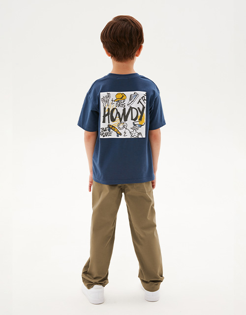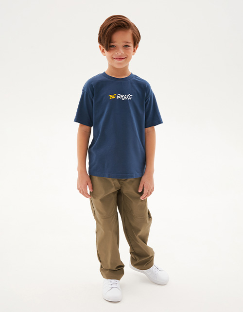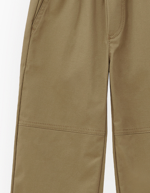 Брюки из твила глубокого оттенка тосканская олива для мальчика. Модель прямого свободного силуэта. Изделие на мягком эластичном поясе, со средней посадкой. Имитация гульфика. Спереди карманы-хулиганы, сзади - накладной.