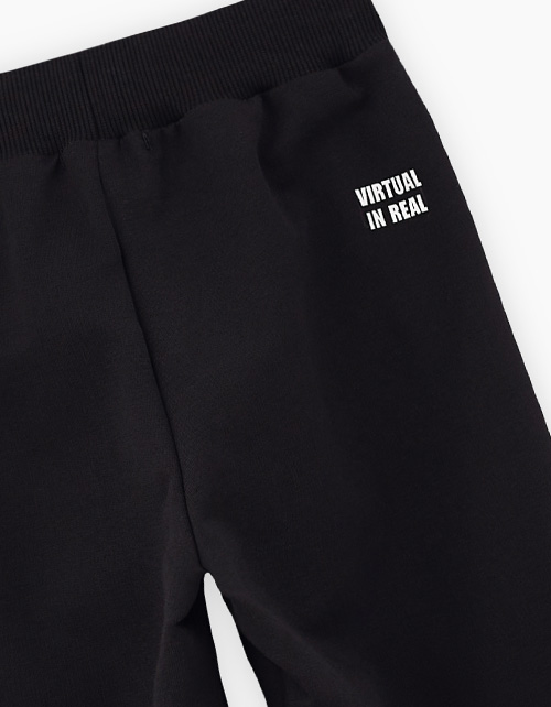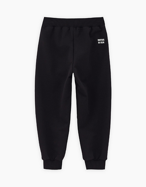 Комфортные чёрные брюки-джоггеры из футера для мальчика. Прямая модель, со средней посадкой. Мягкий эластичный пояс и манжеты. Модель дополнена лаконичным авторским принтом сзади.